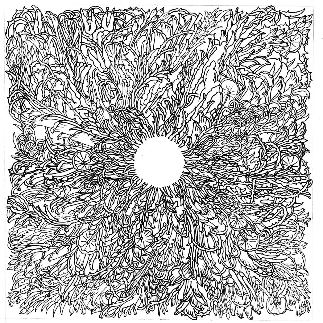 A monumental column, Chandraguptha Thenuwara’s Covert (2021-23) is composed of intricate and interlocking iron filigree symbols painted black: lotus buds, bodies, barbed wire, thorns, stupas, lion tails, weapons, vehicles. Exhibited at the Venice Biennale last year, it travelled to Colombo’s Lionel Wendt Art Gallery in 2023, where a new floor sculpture sprouts out from its base like tree roots. The installation marks Thenuwara’s annual memorial show dedicated to Black July, the anti-Tamil pogrom at the start of Sri Lanka’s civil war (1983-2009), exactly forty years ago. The cylinder towers over its viewers at 222.5 cm in height and 91.4 cm in diameter, while inter weaving lines on the ground cover a 550x550 cm area. On the walls are large-scale black and white drawings, showing similar patterns in ink: expansive landscapes in which icons associated with the conflict recur in two-dimensions.