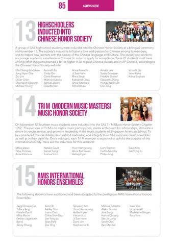 A group of SAS high school students were inducted into the Chinese Honor Society at a bilingual ceremony on November 11. The society’s mission is to foster a love and passion for Chinese among its members, and to inspire new learners with the beauty of the Chinese language and culture. The society also works to encourage academic excellence in Chinese. In order to apply for acceptance, these 27 students must have among other things maintained a B+ or higher in all regular Chinese classes and in AP Chinese, according to the Chinese Honor Society website. Ella Cheng-Bradshaw Jong Hyun Cha Ziyi Lim Oliver Chen Stephanie Ellsworth Michael Young