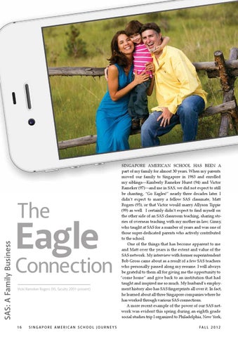 Singapore American School has been a part of my family for almost 30 years. When my parents moved our family to Singapore in 1983 and enrolled my siblings—Kimberly Rameker Hurst (94) and Victor Rameker (97)—and me in SAS, we did not expect to still be chanting, “Go Eagles!” nearly three decades later. I didn’t expect to marry a fellow SAS classmate, Matt Rogers (95), or that Victor would marry Allyson Tippie (99) as well. I certainly didn’t expect to find myself on the other side of an SAS classroom teaching, sharing stories of overseas teaching with my mother-in-law, Ginny, who taught at SAS for a number of years and was one of those super-dedicated parents who actively contributed to the school. One of the things that has become apparent to me and Matt over the years is the extent and value of the SAS network. My interview with former superintendent Bob Gross came about as a result of a few SAS teachers who personally passed along my resume. I will always be grateful to them all for giving me the opportunity to “come home” and give back to an institution that had taught and inspired me so much. My husband’s employment history also has SAS fingerprints all over it. In fact, he learned about all three Singapore companies where he has worked through various SAS connections. A more recent example of the power of our SAS network was evident this spring during an eighth grade social studies trip I organized to Philadelphia, New York, F ALL 2 0 1 2