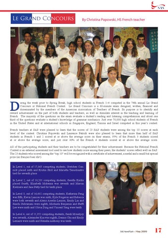 uring the week prior to Spring Break, high school students in French 1–4 competed in the 74th annual Le Grand Concours or National French Contest. Le Grand Concours is a 60-minute exam designed, written, financed and disseminated by the members of the American Association of Teachers of French. Its purpose is to identify and reward achievement on the part of both students and teachers, as well as stimulate interest in the teaching and learning of French. The majority of the questions on the exam evaluate a student’s reading and listening comprehension and about one third of the questions evaluate a student’s knowledge of grammar mechanics. Just over 70,000 high school students of French in the United States and at international schools in Singapore, England, Tunisia and Israel competed in this year’s contest. French teachers at SAS were pleased to learn that the scores of 23 SAS students were among the top 10 scores at each level of the contest. Christina Popowski and Laurence Patrick were also pleased to learn that more than half of SAS students in French 1 and 2 scored at or above the average score on their exams; 95% of the French 3 students scored at or above the average score, and just over 80% of the French 4 students scored at or above the average score. All of the participating students and their teachers are to be congratulated for their achievement. Because the National French Contest is an external assessment tool used to see how students score among their peers, the students’ scores reflect well on SAS. The 23 students who scored among the “top 10” will be recognized with a certificate of achievement, a medal and a small but special prize (en français bien sûr!). In Level 1, out of 17,865 competing students, Gretchen Connick placed sixth and Kristin Skill and Marietta Tanudisastro tied for seventh place. In Level 2, out of 18,201 competing students, Serafin Kaldis placed fourth, Elizabeth Mckenna was seventh and Marcin Kedziera and Jane Petty tied for tenth place. In Level 3, out of 16,482 competing students, Katherina Feng was fifth, Kevin Lancon was sixth, Kyle Forgeron and Rebecca were both seventh and Alexis Asselin-Lauzon, Emily Lin and Saachi Subramani were eighth, Michaela Benjamin and Steffi Lee were ninth and Olivia Ding and Vincent Yang were tenth. In Level 4, out of 11,352 competing students, Sarah Mountjoy was seventh, Alexander Kua was eighth, Dennis Chu and Emily Lemaire were ninth and Natasha Anthony was tenth.