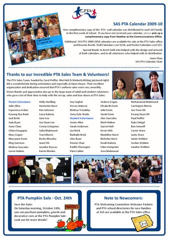 SAS PTA Calendar 2009-10 One complimentary copy of the PTA wall calendar was distributed to each SAS family in the first week of school. If you have not received your calendar, please pick up a complimentary copy from Heather at the Communications Office. Additional SAS PTA 2009-2010 calendars are available for sale at the PTA Sales office and Booster Booth. Wall Calendars cost S$10, and Pocket Calendars cost S$5. Special thanks to Brett Gold who helped with the design and artwork of both calendars, and to all volunteers who helped with its distribution. Anne Chan SAS PTA Calendar Chair