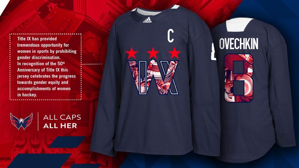 ““ARLINGTON, VA - The Washington Capitals unveiled today a Women in Hockey warmup jersey inspired by Title IX. The jersey, designed by former Professional Women’s Hockey Players Association (PWHPA) goaltender and current PWHPA board member Kimberly Sass of SASS STUDIO, will be worn during warmups when the Capitals host the Chicago Blackhawks on Thursday, March 23, during Women in Hockey Night presented by Fresh Vine Wine.