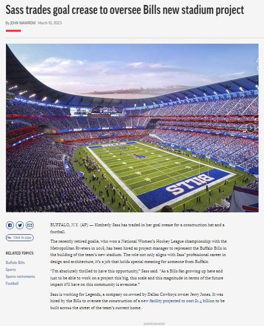 “The recently retired goalie, who won a National Women’s Hockey League championship with the Metropolitan Riveters in 2018, has been hired as project manager to represent the Buffalo Bills in the building of the team’s new stadium. The role not only aligns with Sass’ professional career in design and architecture, it’s a job that holds special meaning for someone from Buffalo.