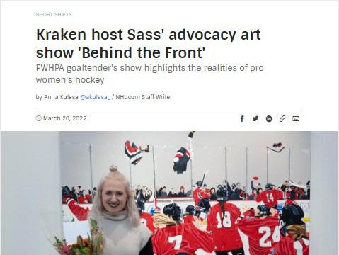 Invited by the Kraken and Starbucks, Sass is in town this week with an 11-piece “Behind the Front” exhibit of paintings, art installations and video intended to raise awareness about the positive and negative experiences for female players at the professional level of hockey. It’s a must-see advocacy art show for Seattle’s hockey community to inform all of us about the state of women’s professional hockey and what we as fans and citizens of the sport can do with that knowledge...”