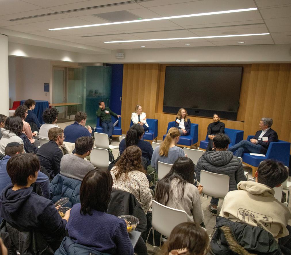 (Clockwise from top left) Ramanan Raghavendran, EAS’89, W’89, LPS’15, Chair of the University’s Board of Trustees (far right) introduced Ben Talks in Palo Alto, which also featured (left to right) Doris Wagner, DiMaura Professor of Biology, Douglas Jerolmack, Professor of Earth and Environmental Science, Simon Richter, Class of 1965 Term Professor of German, and Mark Trodden, Fay R. and Eugene L. Langberg Professor of Physics and Associate Dean for the Natural Sciences. / At the New York Ben Talks (left to right), Katie Barott, Assistant Professor of Biology, Jerolmack, and Trodden discussed “Earth, Sea, and Sky.” / Fariha Khan (left) and David Eng, Richard L. Fisher Professor of English, co-directors of the Asian American Studies Program, update the crowd at an Asian American Studies Now event in New York. / Tabeen Hossain C’17, LPS’20, mentors a student at the PWA roundtable. / At the CAMS event Careers in Data Science, students hear about an array of options from (left to right) Randall Winn, PAR’28, Melissa Honour, Head of Product Innovation at Blue Shield of California, Tara Thiagarajan, founder and chief scientist at Sapien Labs, Christen Smith, President of Service Lines and Solutions at LMI, and moderator Eric Edell, C’99. Winn and Edell, who organized the panel, are co-founders and managing partners at the investment firm 22C Capital.