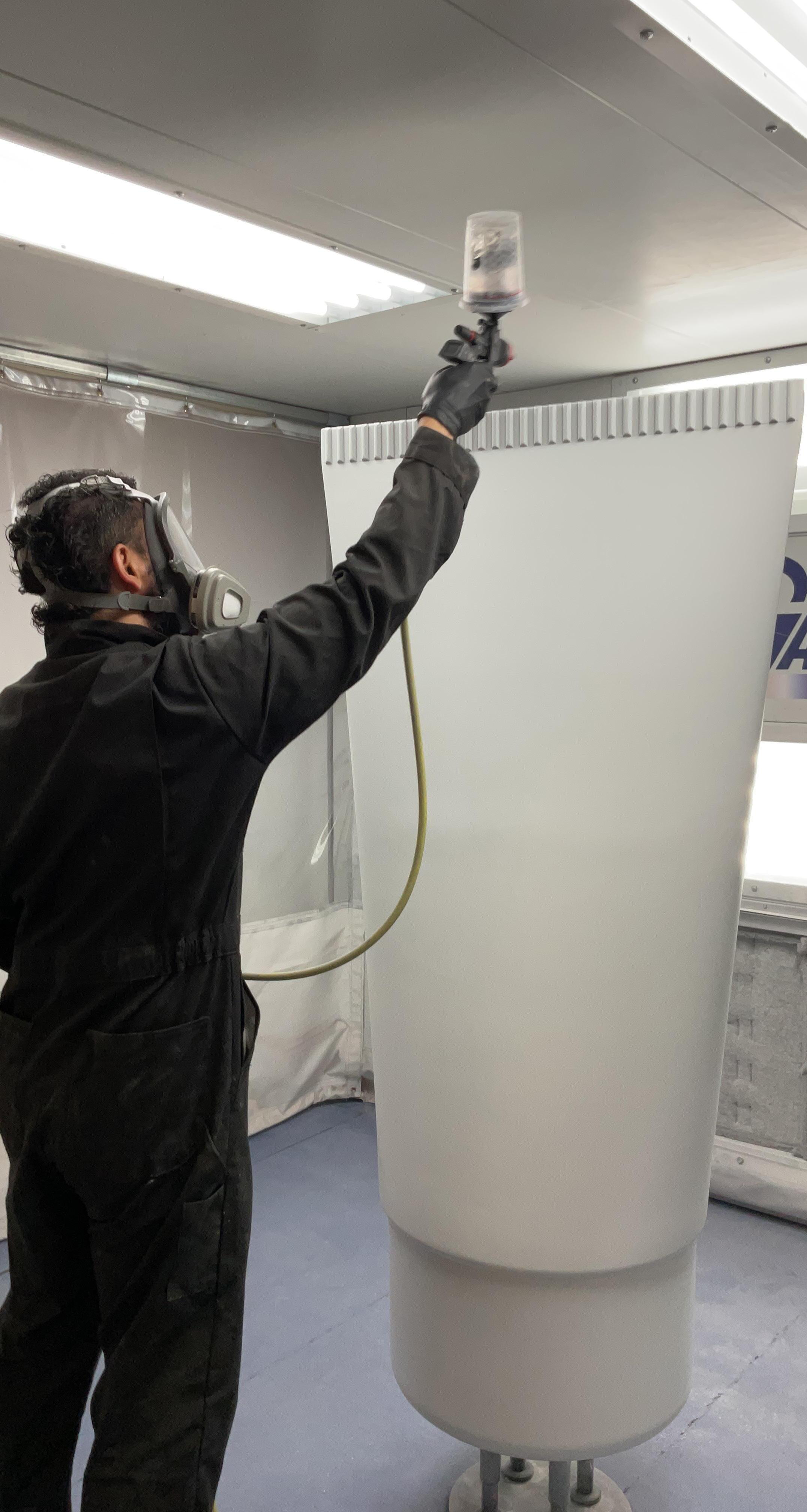 “We usually use automotive finishes but, in this case, we couldn’t match the specific pantone and are using a cabinet paint to spray them. Our SATA guns are great for this paint too and have been going all week nonstop.”