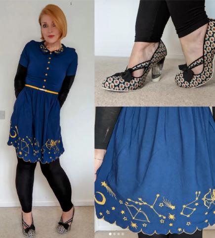 "I have only ever shopped in charity shops, even when it wasn't trendy. It's like a treasure hunt and when I find something amazing it feels serendipitous... like it was waiting there just for me. And on top of that, I'm supporting sustainable fashion. I bought this amazing dress in the Salvation Army shop in Balham with my younger sister, who I've converted to charity shops, too!"