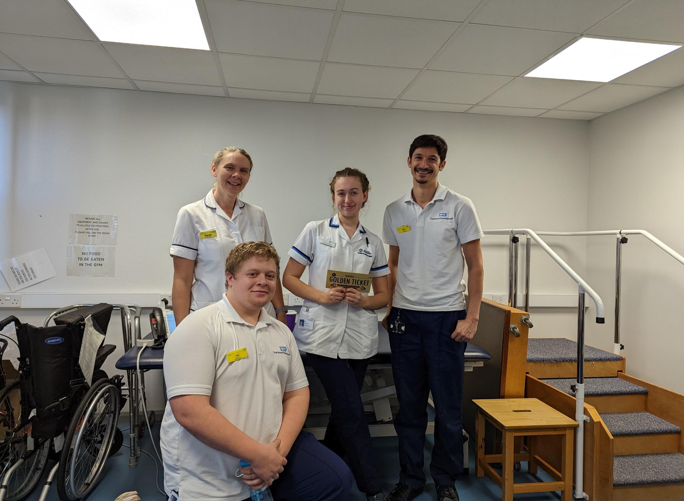 Daisy (left, middle) was given the ticket by team members (L-R) Sarah Sandy, Team Lead for Surgical & Critical Care Physiotherapy, Matt Crolla, Specialist Physiotherapist, and (front) Joe Brisbourne, Physiotherapist.