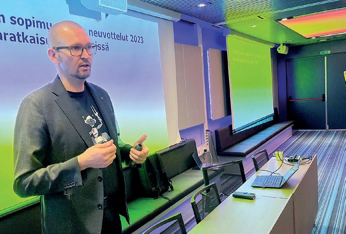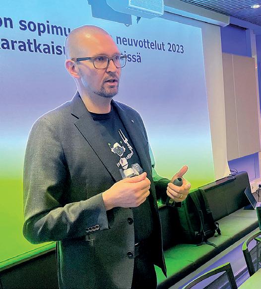 Kokoukseen toi Insinööriliiton terveh dyksen edunvalvontajohtaja Petteri Oksa. Hän kertoi satilaisille viimeisimmät tiedot TES-neuvottelujen tilanteesta ja siitä, mil tä meidän insinöörien työmarkkinatilanne nyt yleisesti vaikuttaa.