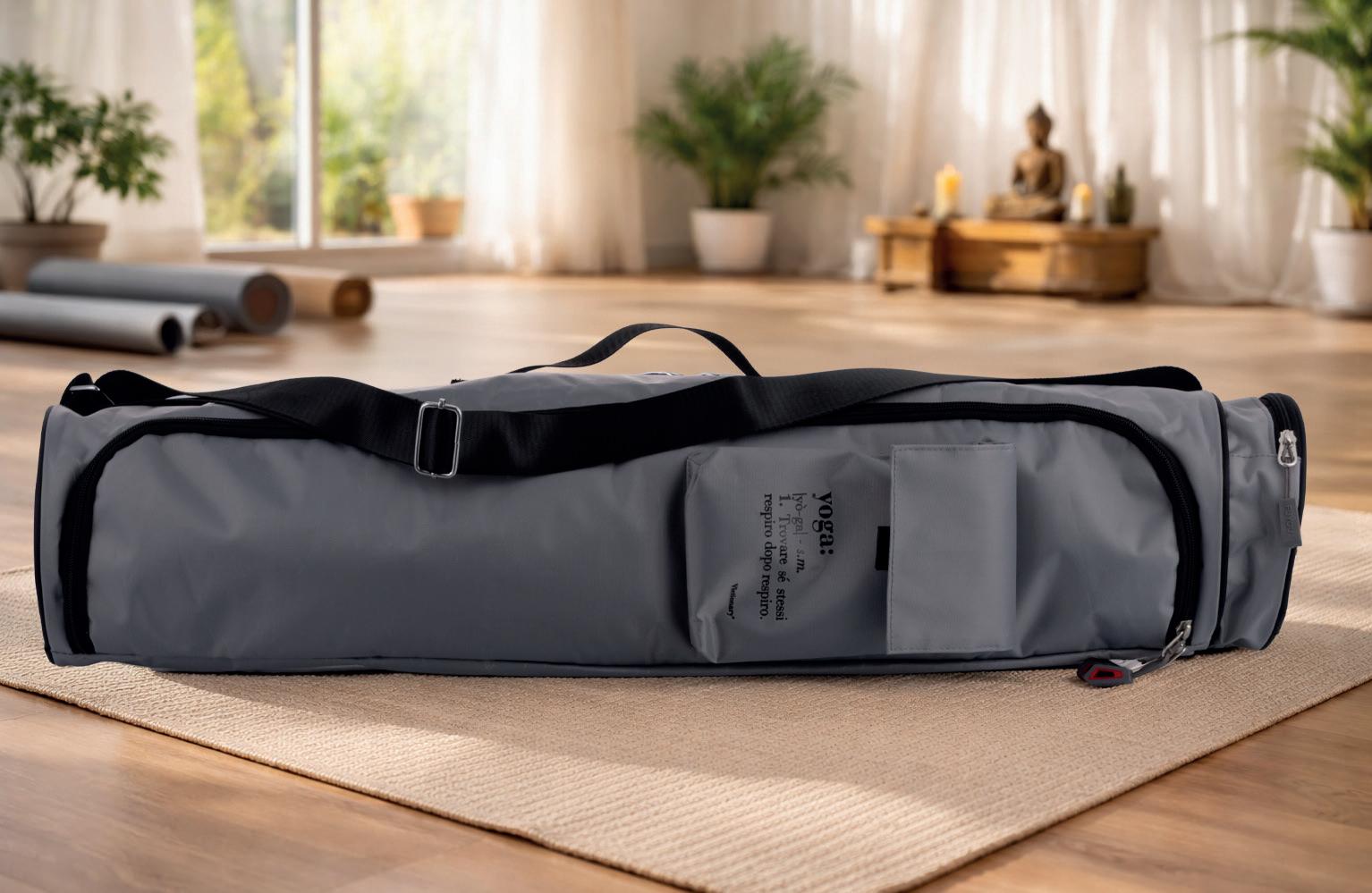 Perfetta per trasportare un tappetino Yoga con tracolla regolabile e tasca esterna porta cellulare / documenti con chiusura in velcro. Pratica e capiente.
