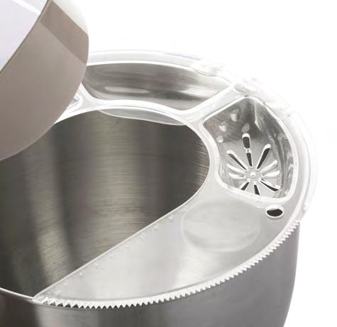 Dough hook in aluminium alloy • stainless steel wire whisk with ABS head • Aluminium alloy flat or leaf whisk • Dishwasher-safe wire whisk and bowl • Dough hook and flat whisk hand washable • Slow start function to prevent ingredients from spilling out when starting the machine • Silicone non-slip feet