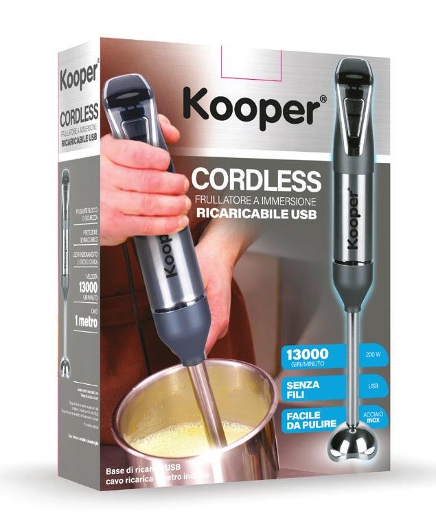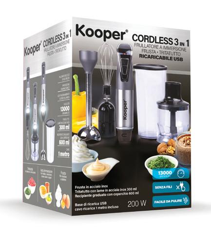 • Pulsante blocco di sicurezza • Protezione contro il sovraccarico • Led di funzionamento e di stato di carica • Tempo di ricarica: 3-4 ore • 3 accessori inclusi: Frusta in acciaio inox • Recipiente tritatutto con lame in acciaio inox 300 ml • Frullatore a immersione • Lunghezza cavo: 100 cm • Batteria: 7,4 V DC 1500 mAh • Input ricarica: 5V DC 2A • Potenza massima: 200 W • Barra inferiore lavabile in lavastoviglie