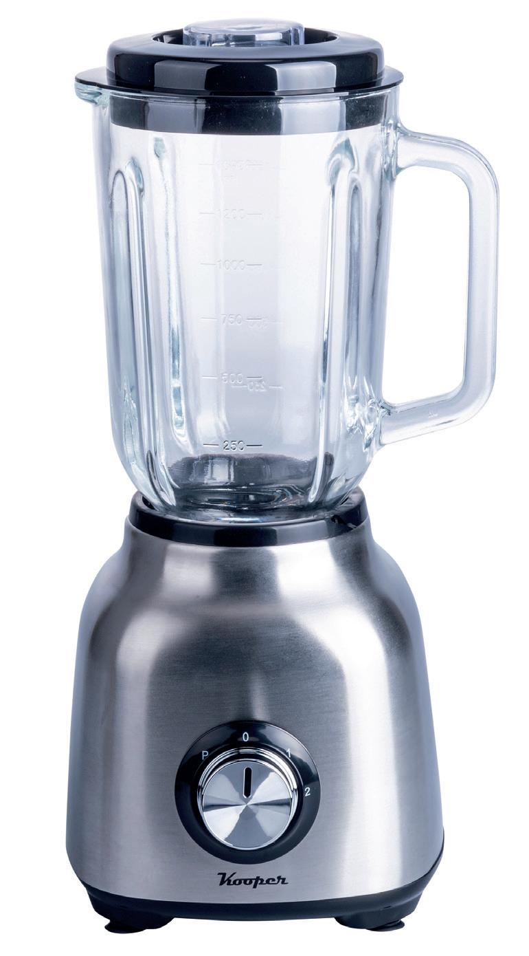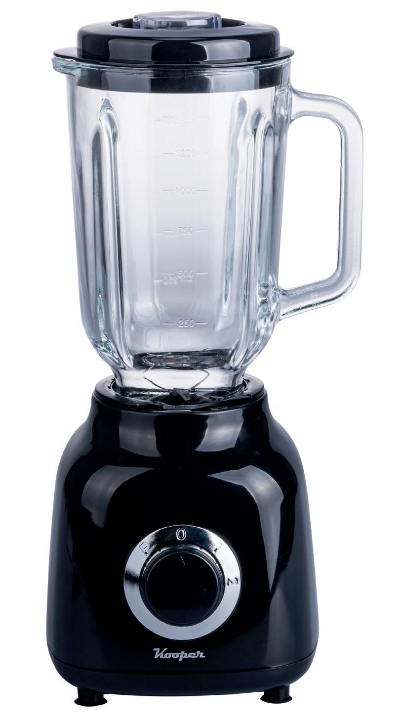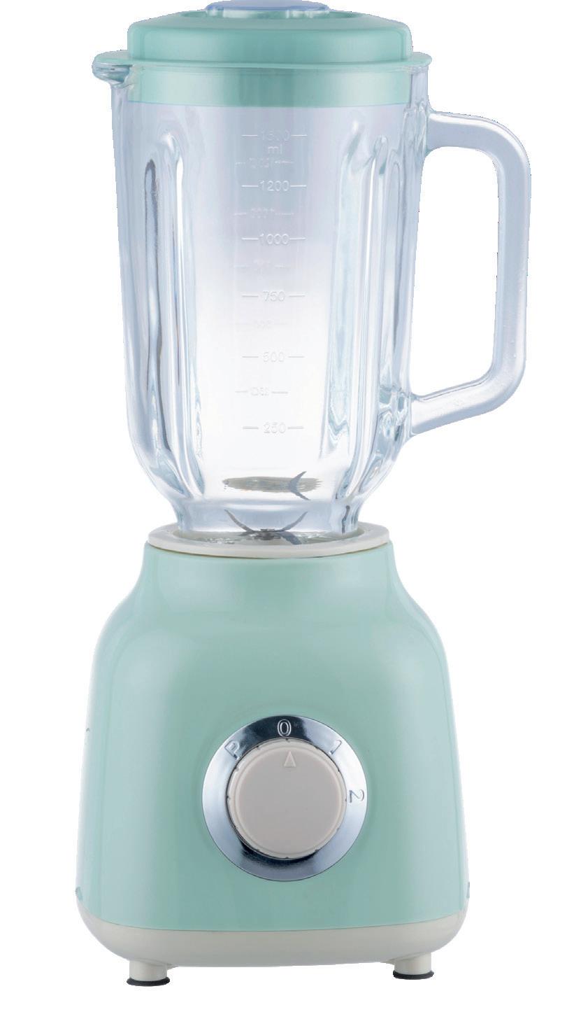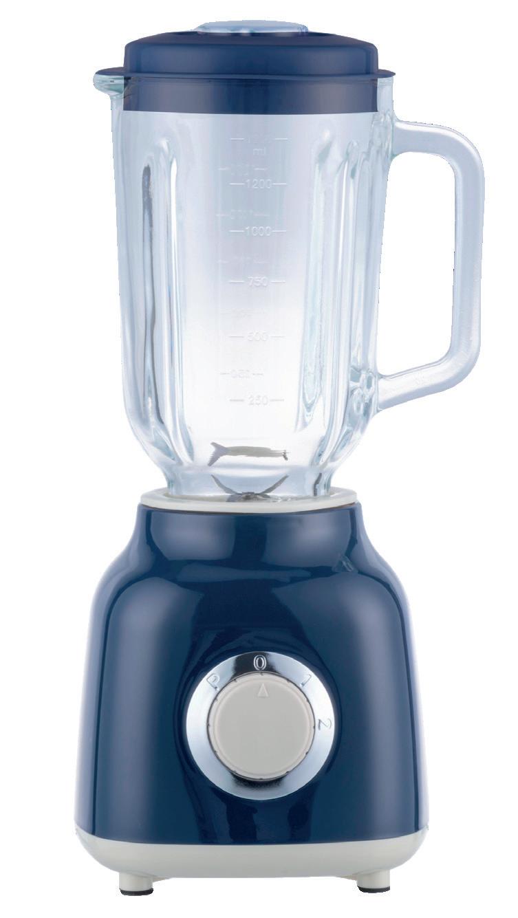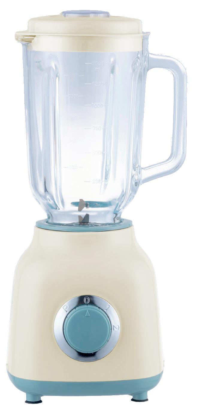 Plastic base (PP) with ABS knob • Plastic lid (PE) with plastic pouring cap (PS) • Glass jug with side handle • 4 stainless steel blades • Easy to use • 2 speeds + Pulse • Graduated jug capacity: 1.5 Liters • Non-slip TPR rubber feet Cable length: 120 cm • Hand wash • Power: 500 W