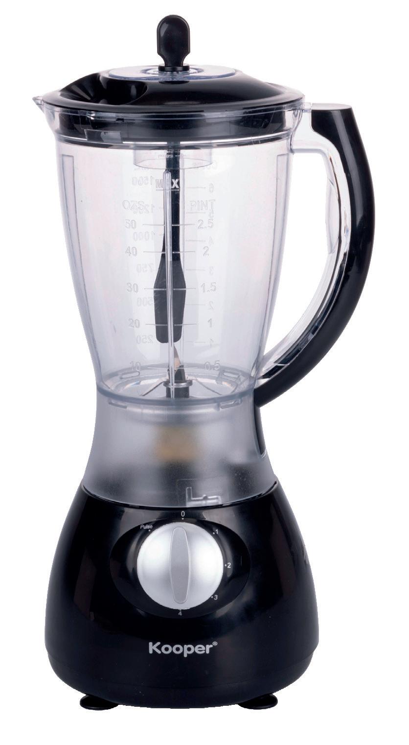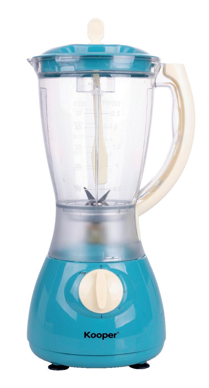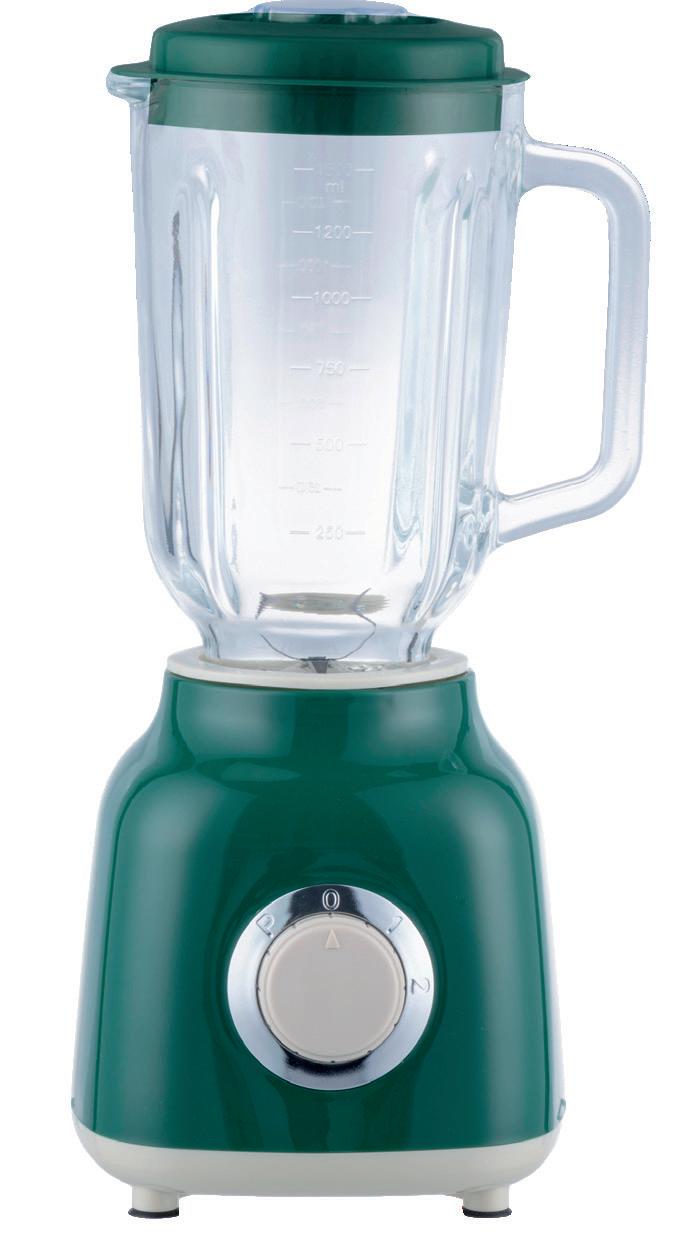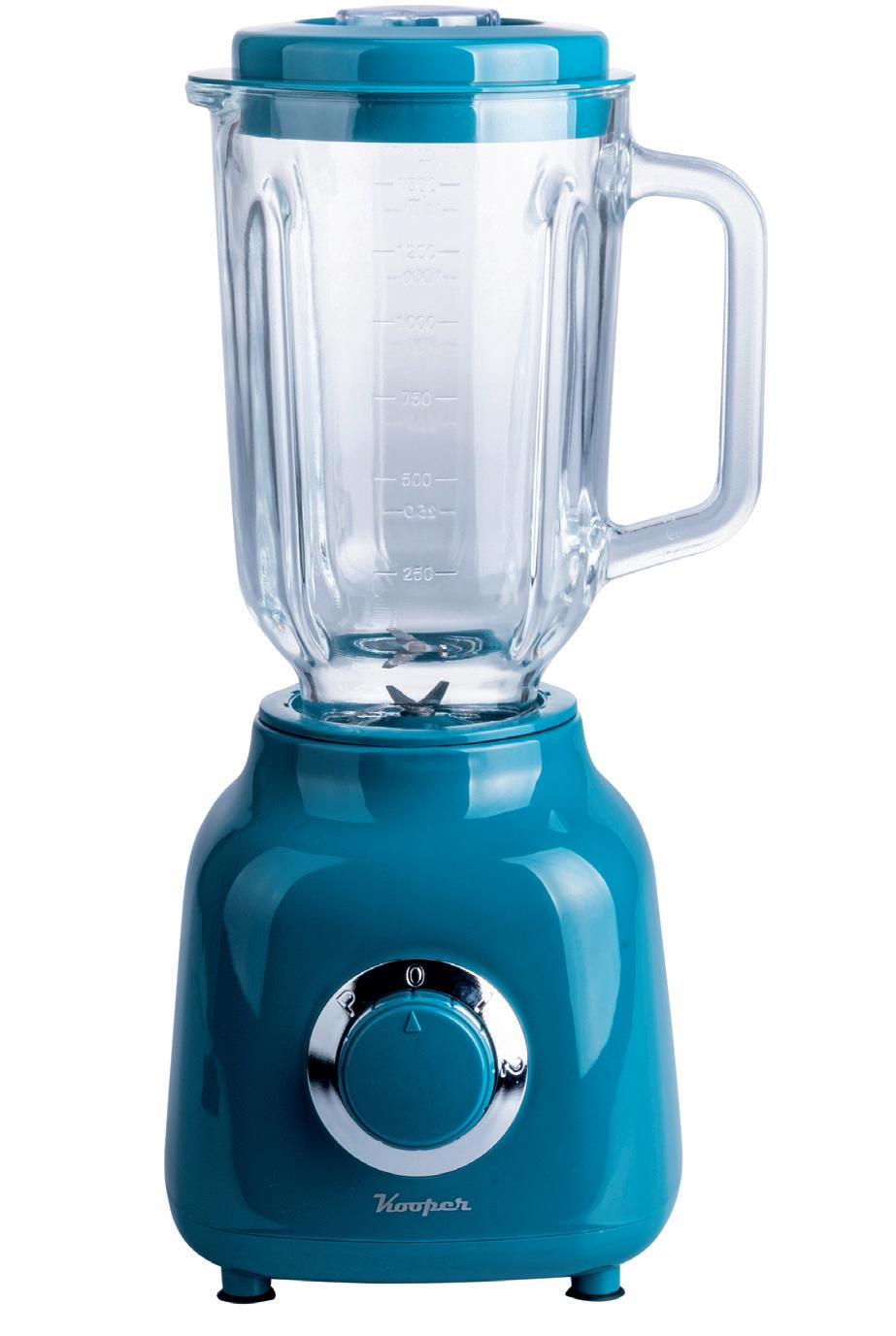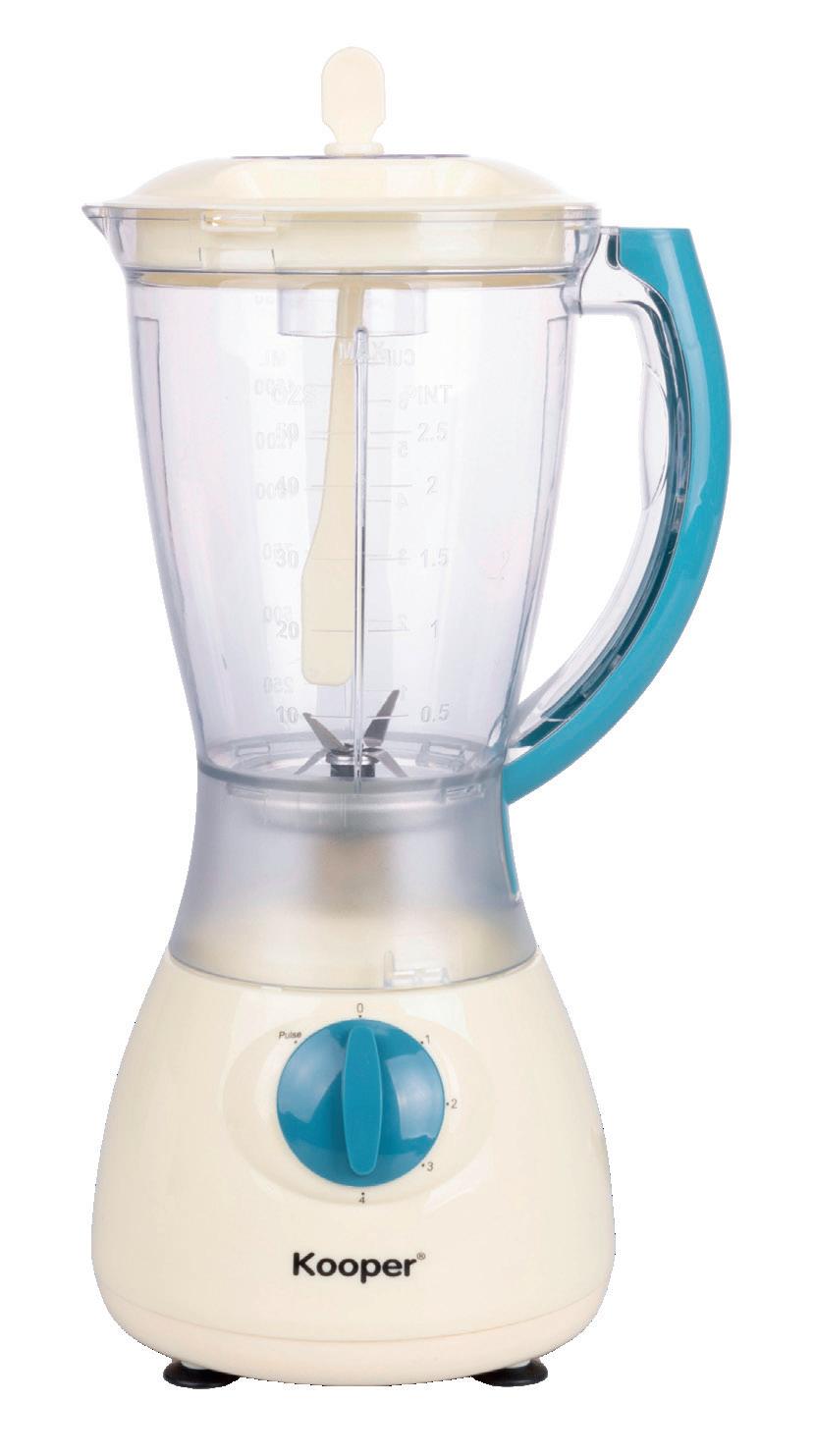Plastic base (PP) with ABS knob • Plastic lid (PE) with plastic pouring cap (PS) • Glass jug with side handle • 4 stainless steel blades • Easy to use • 2 speeds + Pulse • Graduated jug capacity: 1.5 Liters • Non-slip TPR rubber feet Cable length: 120 cm • Hand wash • Power: 500 W