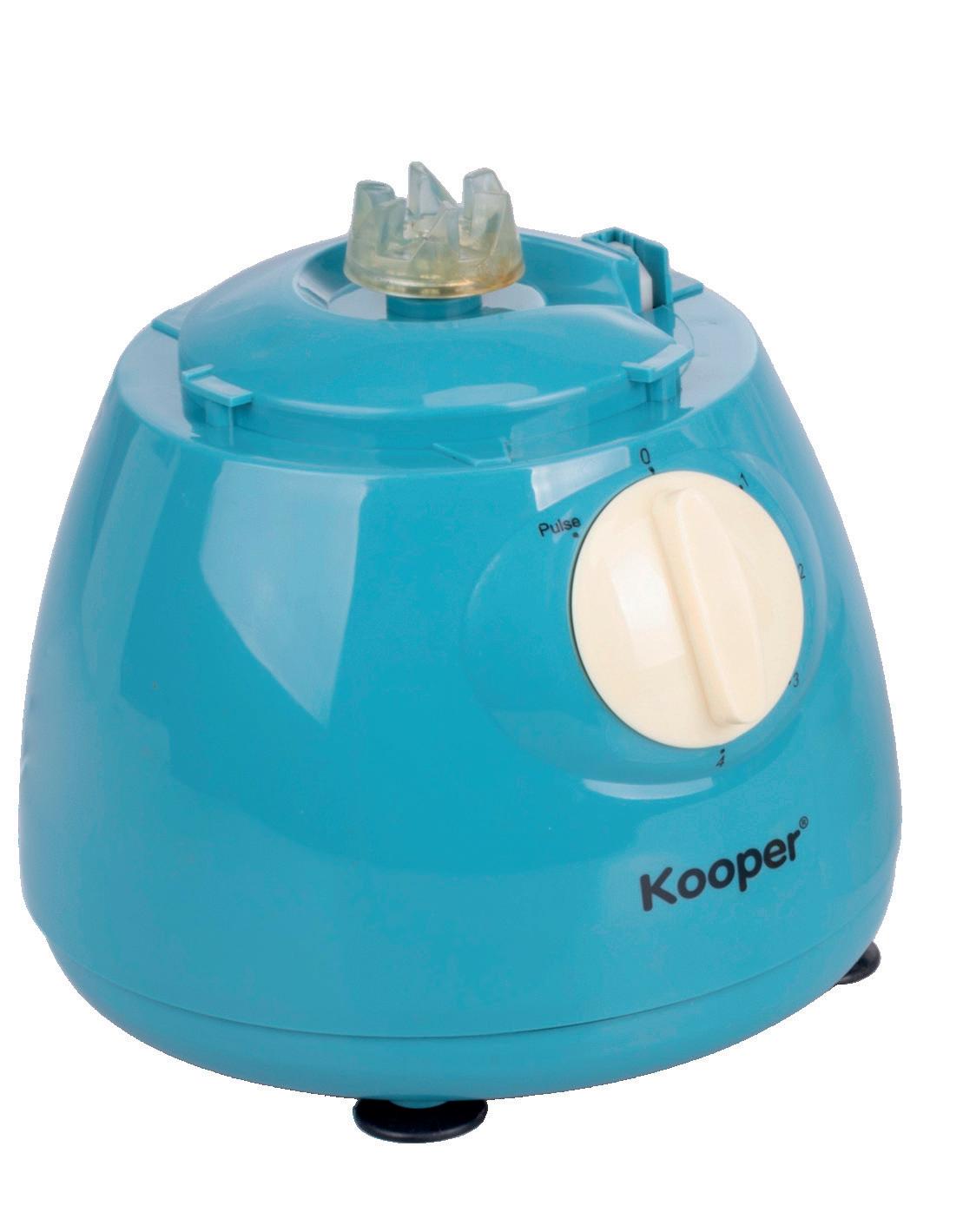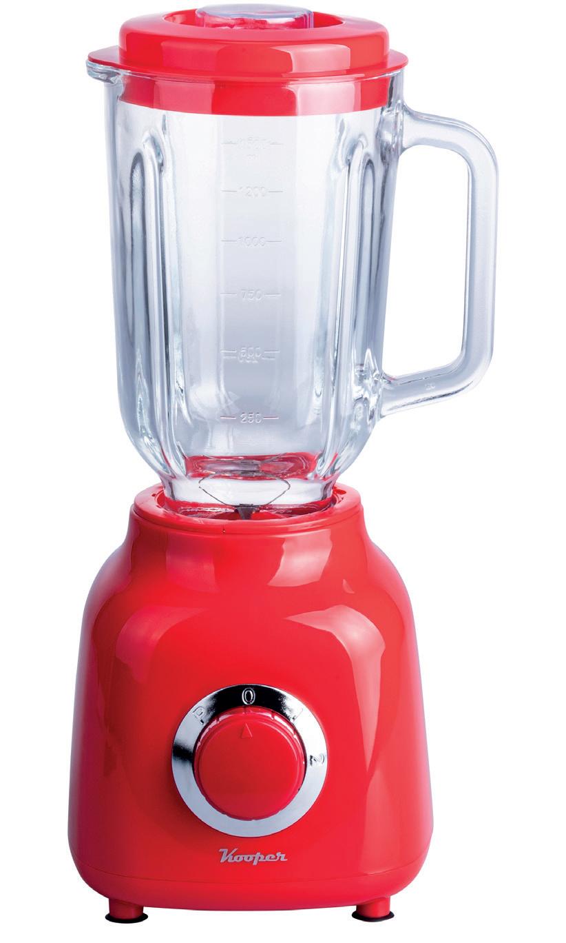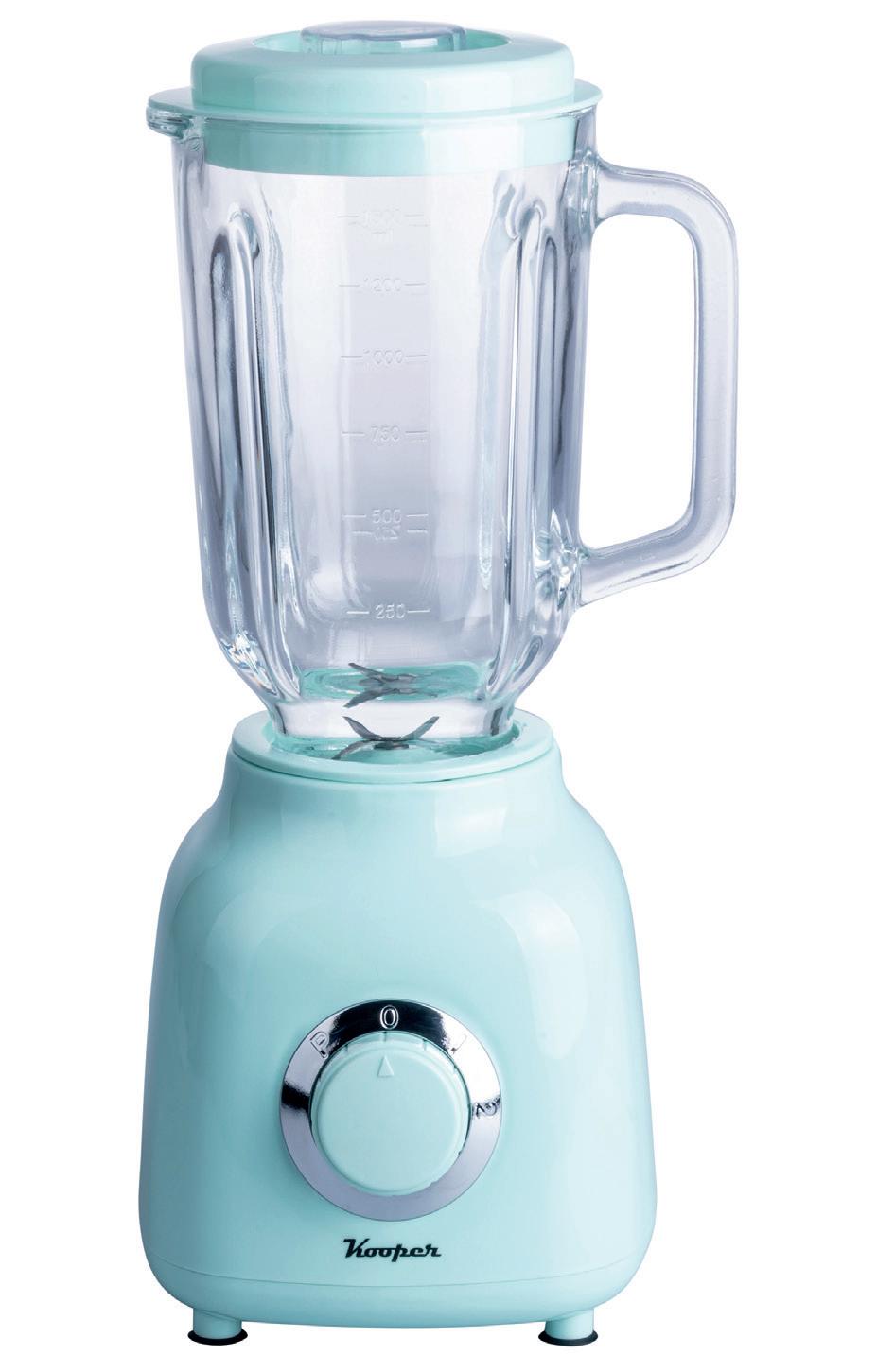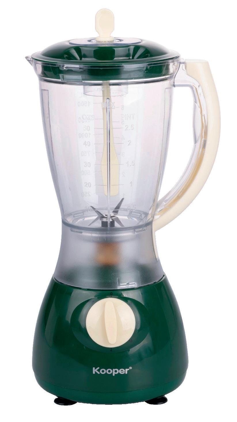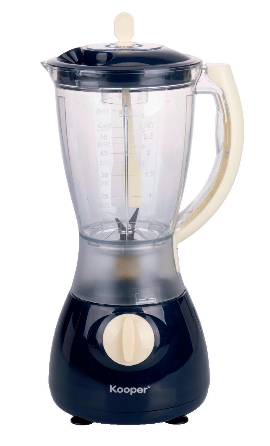 Plastic base (PP) with ABS knob • Plastic lid (PE) with plastic pouring cap (PS) • Glass jug with side handle • 4 stainless steel blades • Easy to use • 2 speeds + Pulse • Graduated jug capacity: 1.5 Liters • Non-slip TPR rubber feet Cable length: 120 cm • Hand wash • Power: 500 W