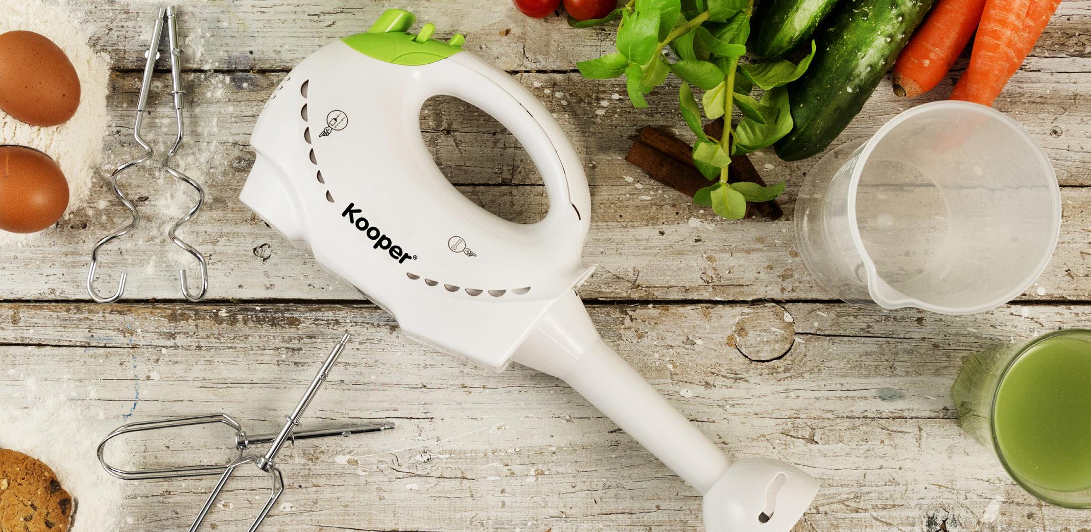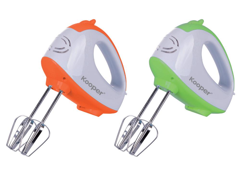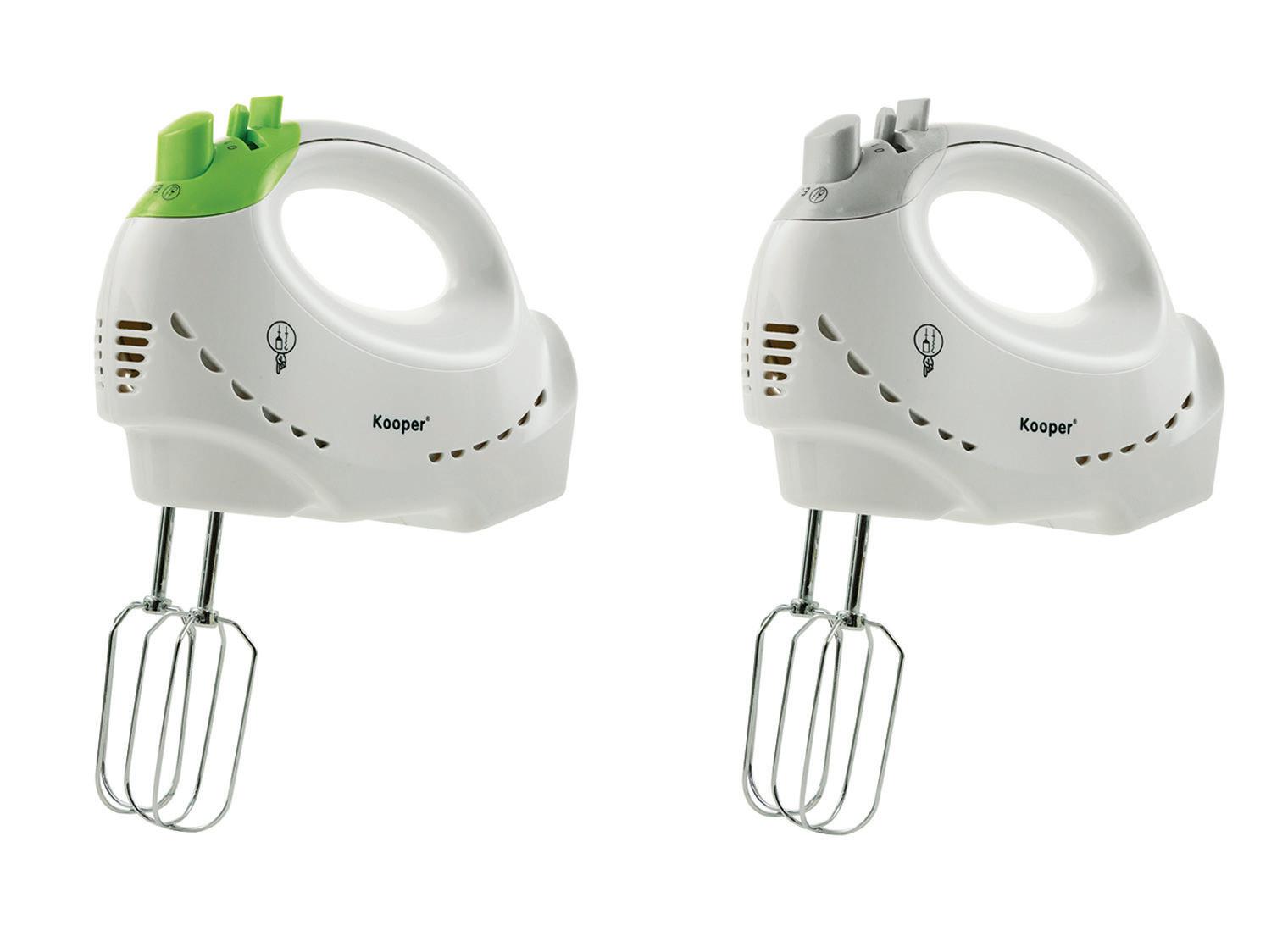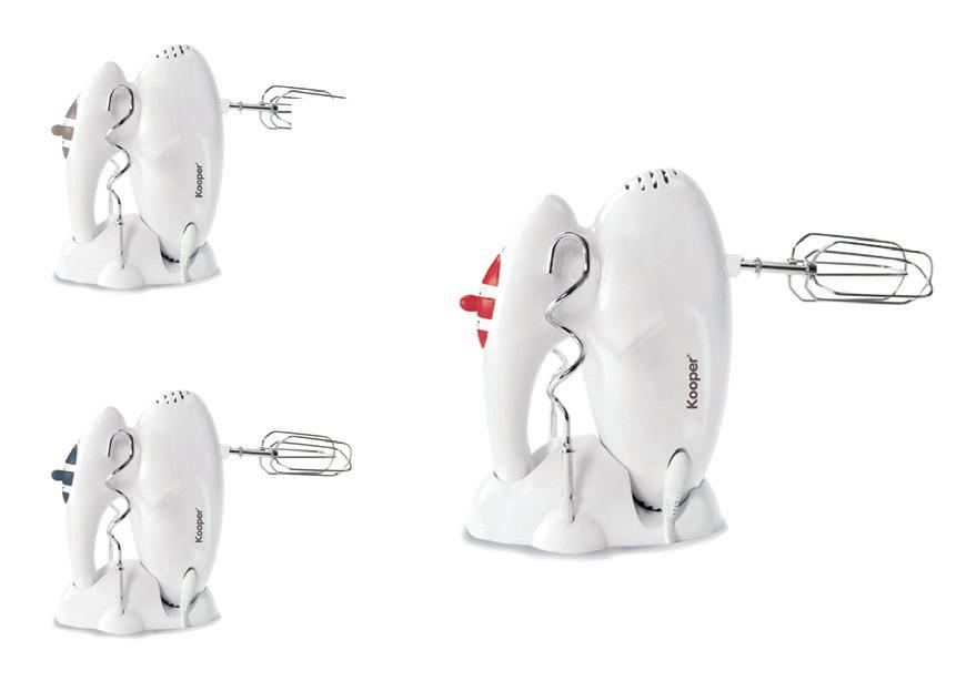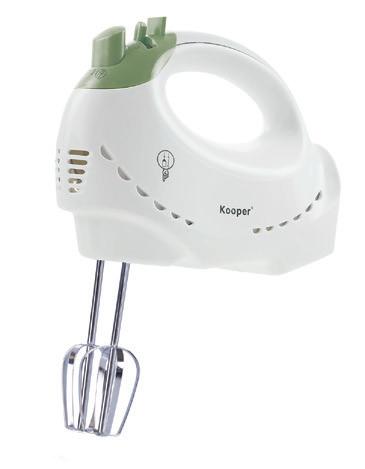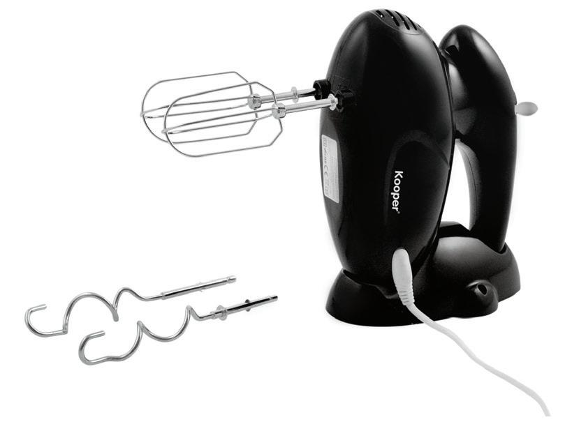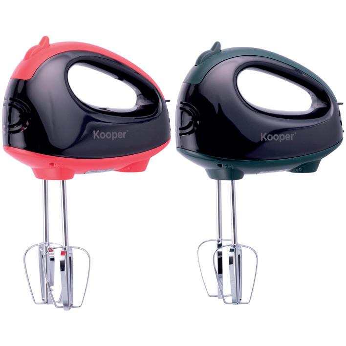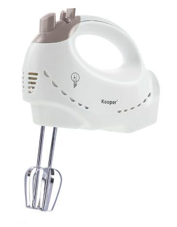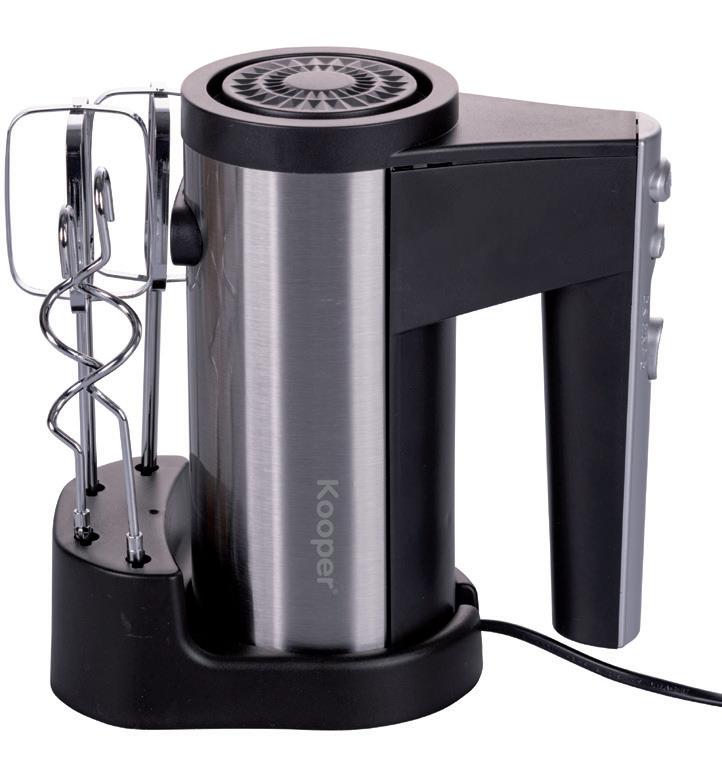 5 Speed Settings • Turbo Button • 2 Steel Dough Hooks • 2 Steel Beaters • Release Button for swapping beaters • Body in Plastic • Stainless Steel Accessories • Ergonomic Grip