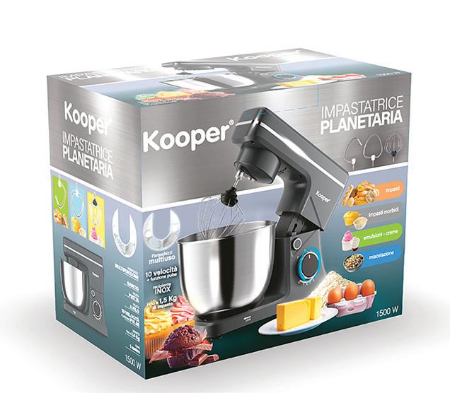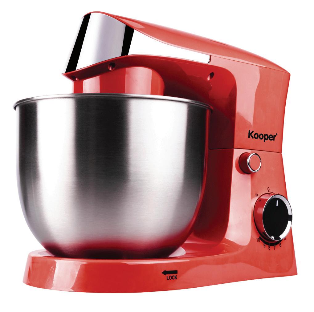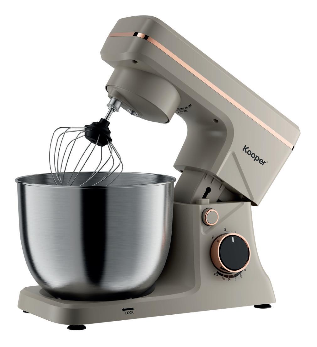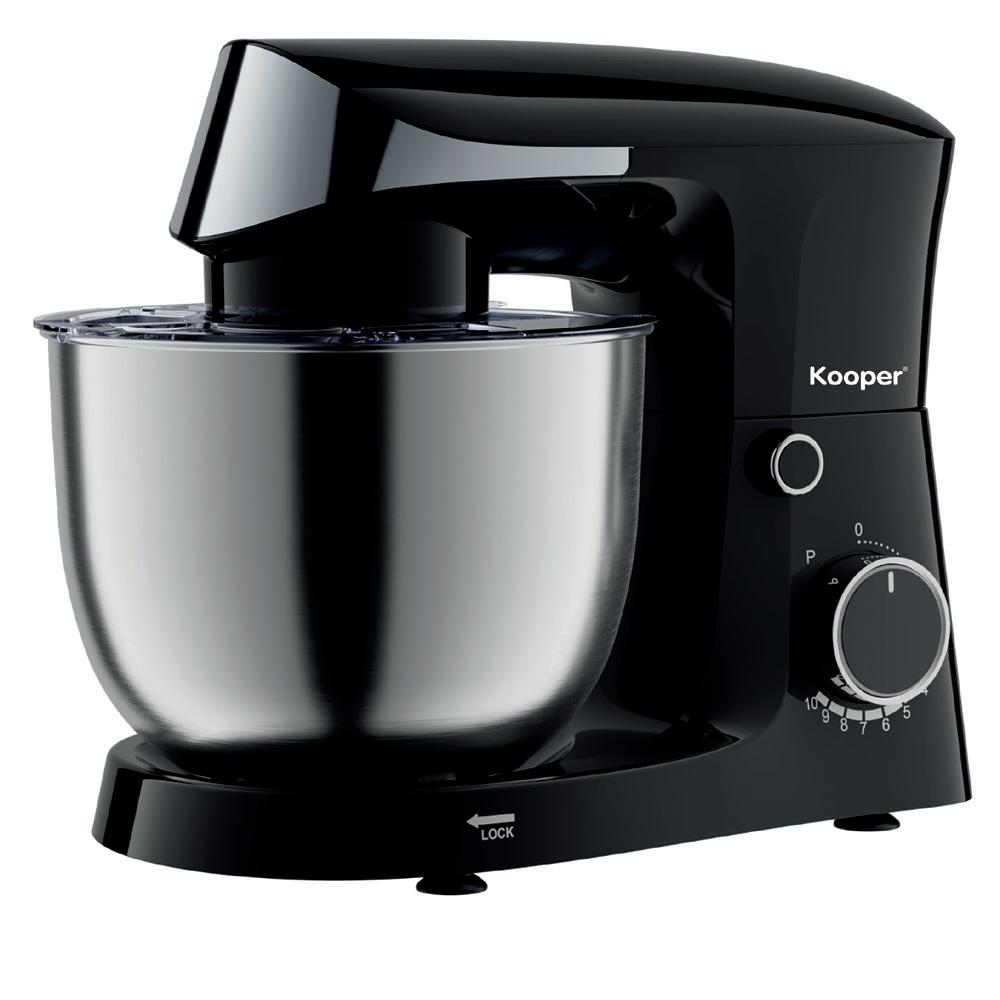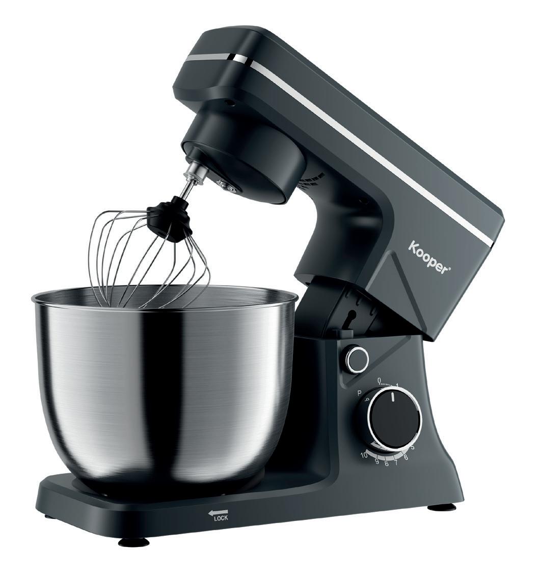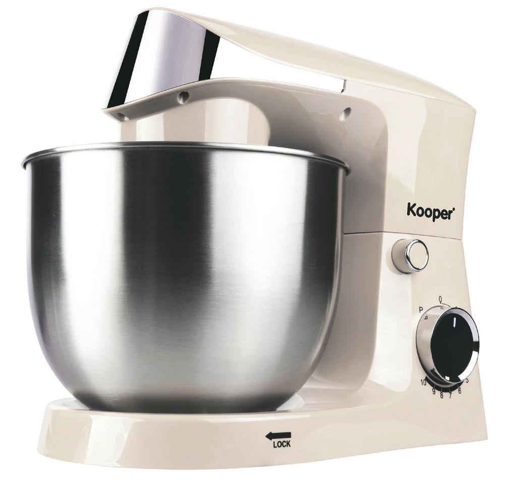 Stand mixer Kooper • Removable stainless steel bowl with plastic inserts • Multifunction ABS splash guard -Egg separator -Meter (10-20-30 ml) -Meter ruler -Cutting parts (smooth and serrated) -Inspection lens 10 speeds + pulse function • Volumetric capacity: 5.5 L • Up to 1.5 kg dough • Lifting mechanism with safety switch • 3 accessories included