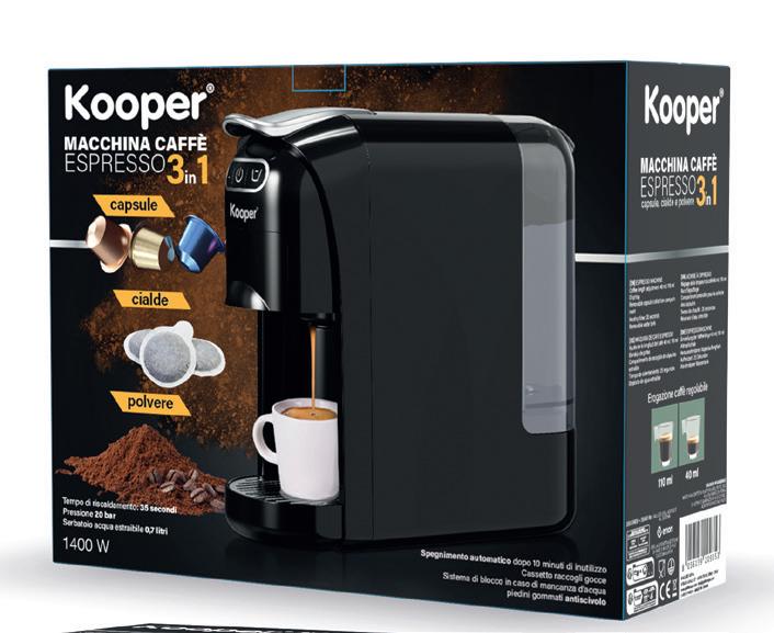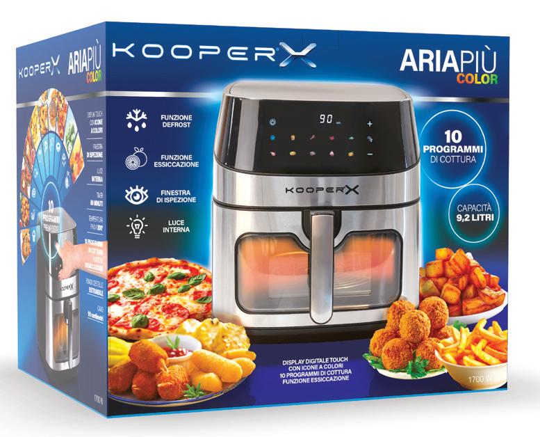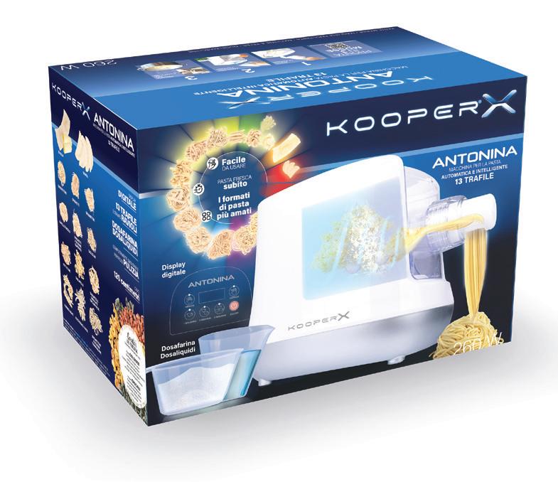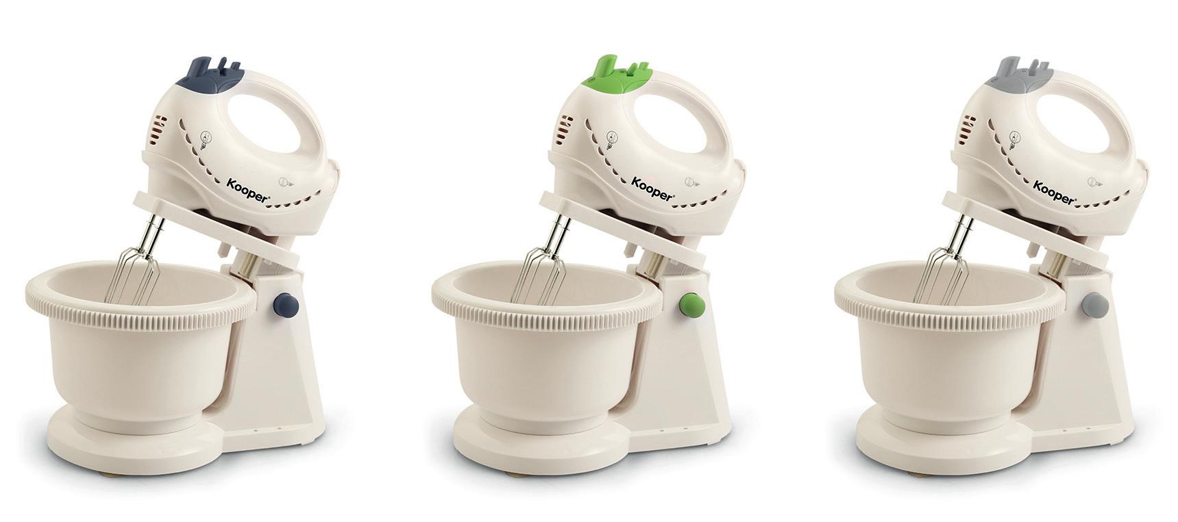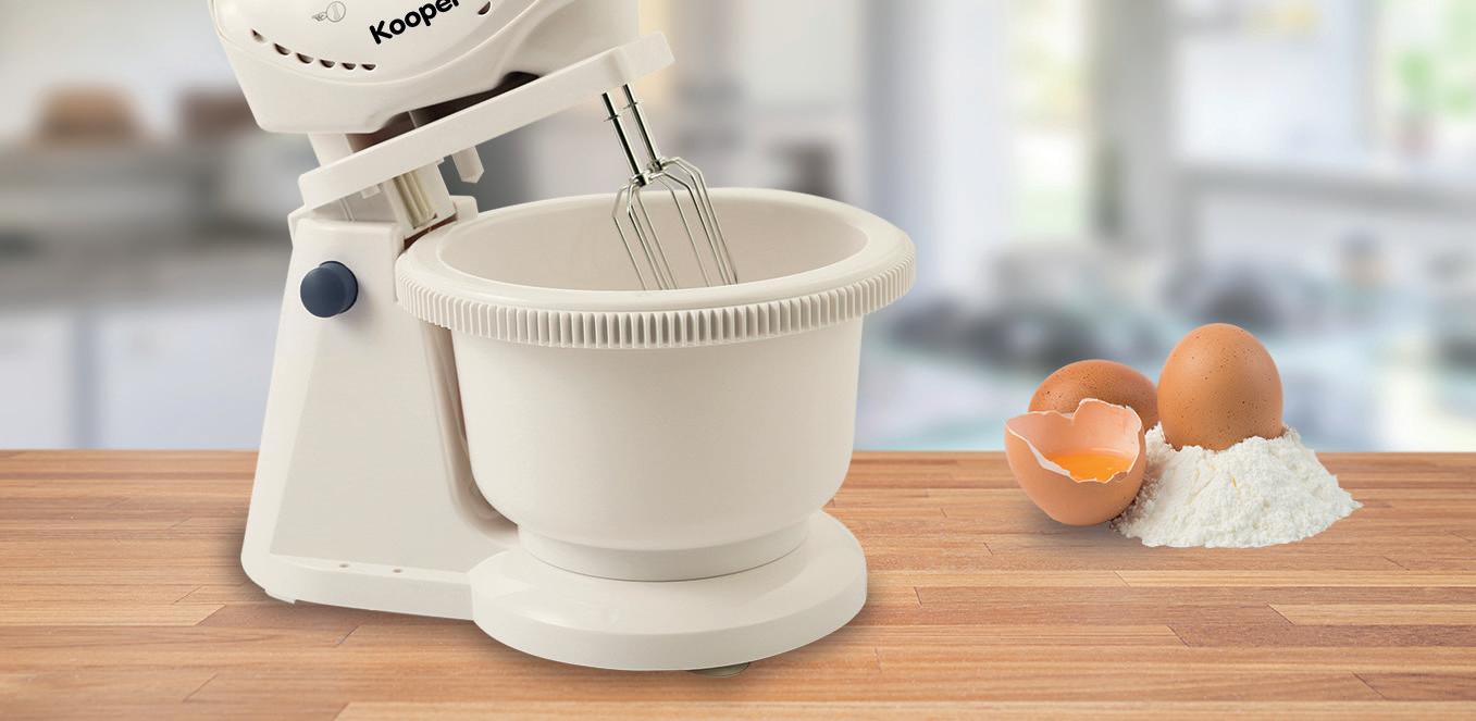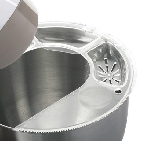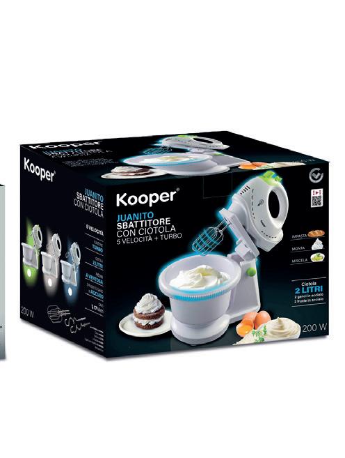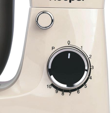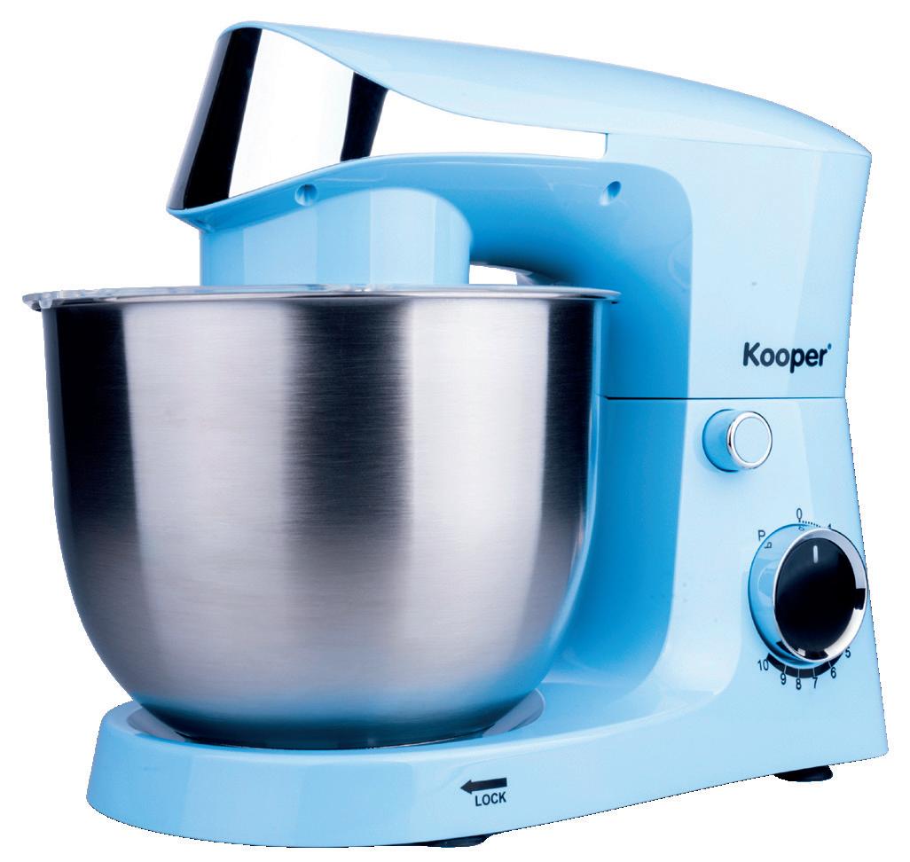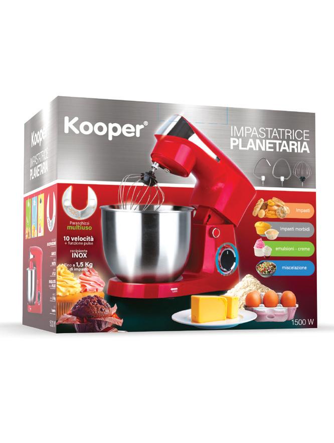 Stand mixer Kooper • Removable stainless steel bowl with plastic inserts • Multifunction ABS splash guard -Egg separator -Meter (10-20-30 ml) -Meter ruler -Cutting parts (smooth and serrated) -Inspection lens 10 speeds + pulse function • Volumetric capacity: 5.5 L • Up to 1.5 kg dough • Lifting mechanism with safety switch • 3 accessories included