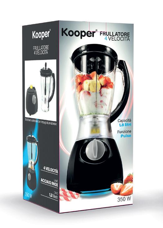 4 velocità + funzione Pulse • 4 lame in acciaio inox • Brocca graduata in plastica (AS) con impugnatura laterale • Bicchiere in plastica (AS) con dosatore • Spatola per miscela in plastica (PP) • Piedini antiscivolo a ventosa • Brocca, coperchio, spatolina lavabili in lavastoviglie • Wattaggio: 350 W