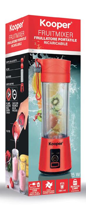 Coperchio in polipropilene (PP); boccale in policarbonato (PC); base motore e raccordi in ABS, guarnizione in silicone • 6 lame in acciaio inossidabile • Ricaricabile con cavetto usb incluso • Dotato di laccetto di trasporto • Pulsante touch di accensione e spegnimento • Led di funzionamento • Dotato di funzione safety stop • Capacità 380 ml • Lunghezza cavo USB-micro usb: 80 cm • Carico pieno 15.000 RPM • Voltaggio: 3,7 V • Batteria: 1200 mAh