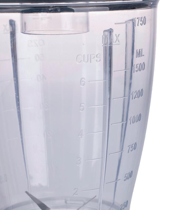 Plastic base (PP) with ABS knob • Plastic (PE) lid with plastic (PS) pouring cap • Glass carafe with side handle • 4 stainless steel blades • 2 speeds+Pulse • Graduated carafe capacity: 1.5 L • TPR rubber non-slip feet • Cable length: 120 cm • Hand wash • Wattage: 350 W