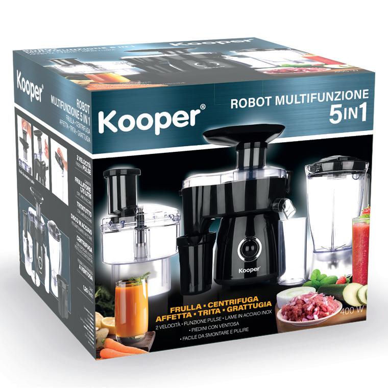 Struttura in ABS, plastica (AS) e (PP) • Lame in acciaio inox • Sistema compatto 5 in 1: Frullatore • Affetta tutto • Tritatutto • Centrifuga • Grattugia • 2 velocità di funzionamento Funzione Pulse • Vaso frullatore • Contenitore Tritatutto • Estrattore con coperchio, filtro e pestello • 2 contenitori di raccolta • Capienza caraffa: 1,75 Litri • Disco in acciaio inox per grattugiare e affettare • Potenza: 400 W • Cavo: 120 cm