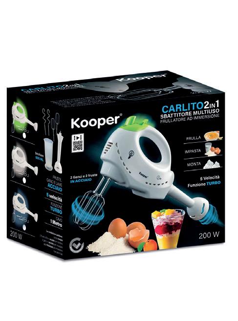 2 ganci per impastare • 2 fruste per montare • 1 frullatore ad immersione • 5 velocità • Funzione turbo • Pulsante espulsione accessori • Bicchiere 600 ml • Lunghezza cavo: l. 98 cm • Potenza: 200 W