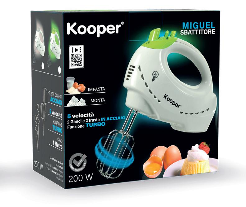 Con ciotola girevole • 5 velocità • Pulsante turbo N. 2 ganci in acciaio per impastare • N. 2 fruste in acciaio per montare • Pulsante di espulsione accessori • Corpo in plastica • Accessori in acciaio inox • Piedini a ventosa • Base di appoggio • Presa ergonomica • Capacità: 2 litri Lunghezza cavo 117 cm • Potenza massima: 200 W • 50 Hz