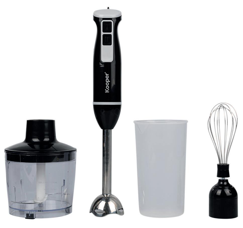 3 functions: Hand blender • Mini grinder • Whisk whisk • 2 speeds • Interchangeable accessories • 2 stainless steel • Mini food processor capacity: 500 ml • Beaker capacity: 600 ml • Whisk for whipping and mixing made of ABS and stainless steel • Wattage: 600 W • Cable length 120 cm