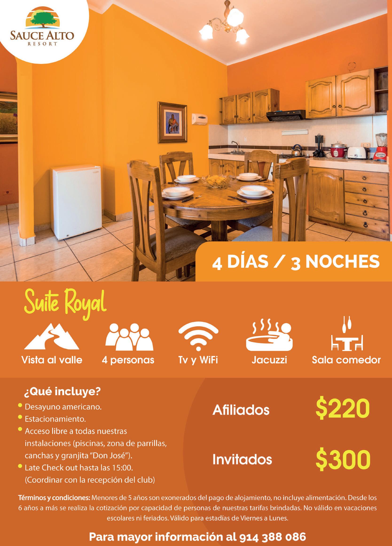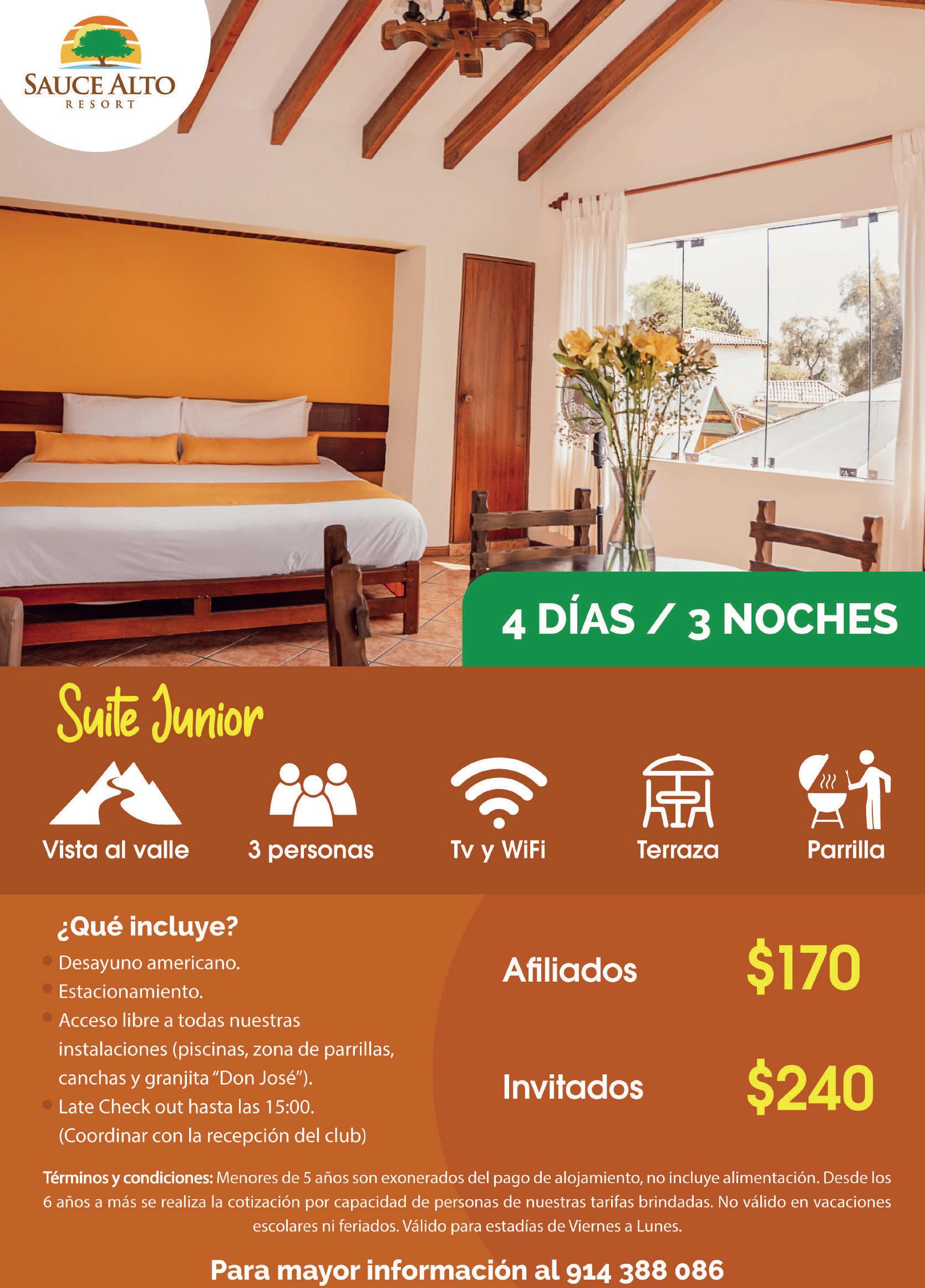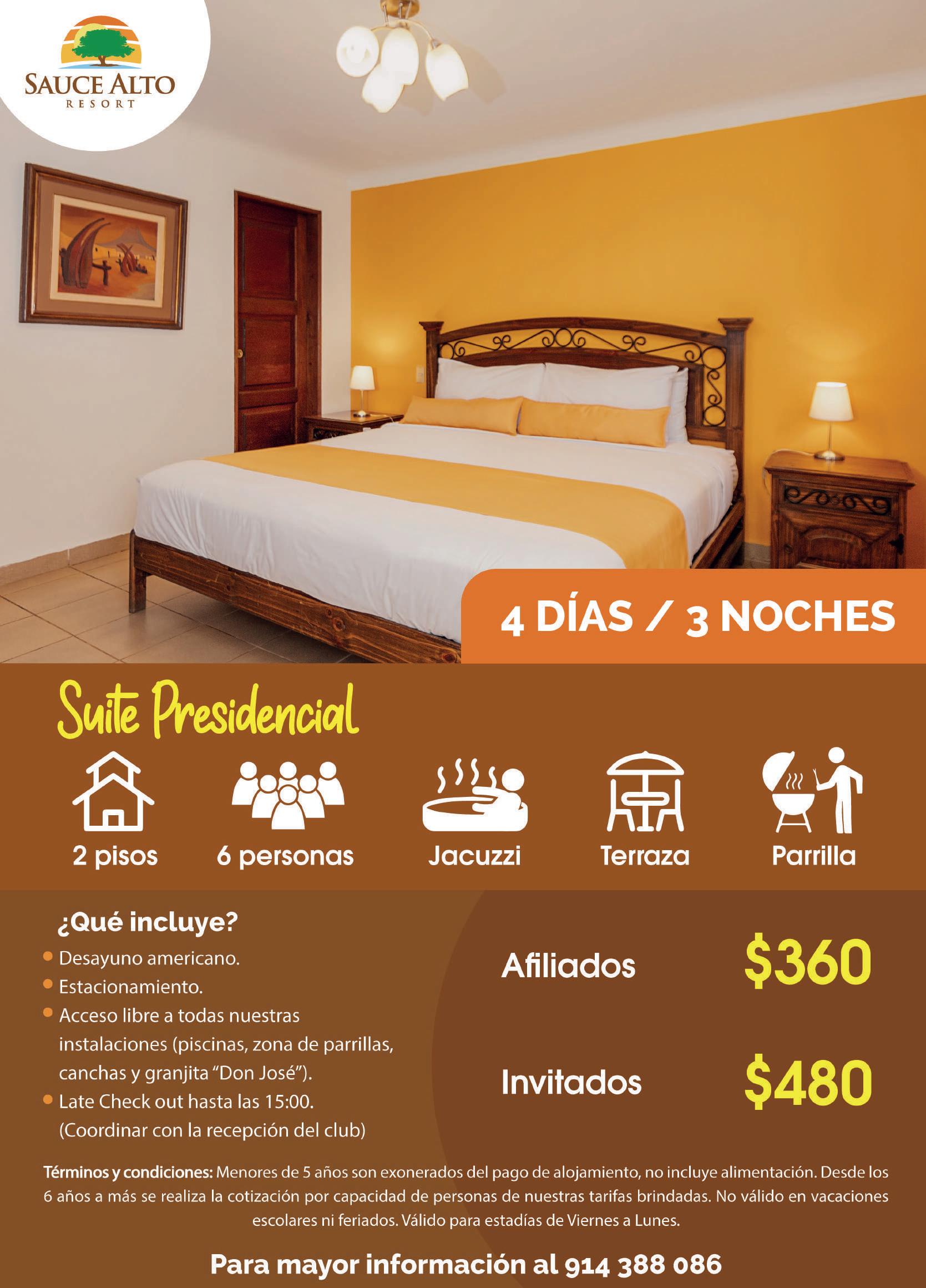 Presidencial Suite ¿Qué incluye? *precios por noche Desayunos. Estacionamiento. Acceso libre a todas nuestras instalaciones (piscinas, zona de parrillas y canchas). Acceso a la granjita “Don José”. Contamos con los protocolos de higiene y limpieza para su seguridad en Sauce Alto Resort. Términos y condiciones: Menores de 5 años son exonerados del pago de alojamiento, no incluye alimentación. Desde los 6 años a más se realiza la cotización por capacidad de personas de nuestras tarifas brindadas. No válido en vacaciones escolares ni feriados. Válido para estadías de Domingo a Jueves hasta el 06 de julio de 2023. Para mayor información al 914 388 086