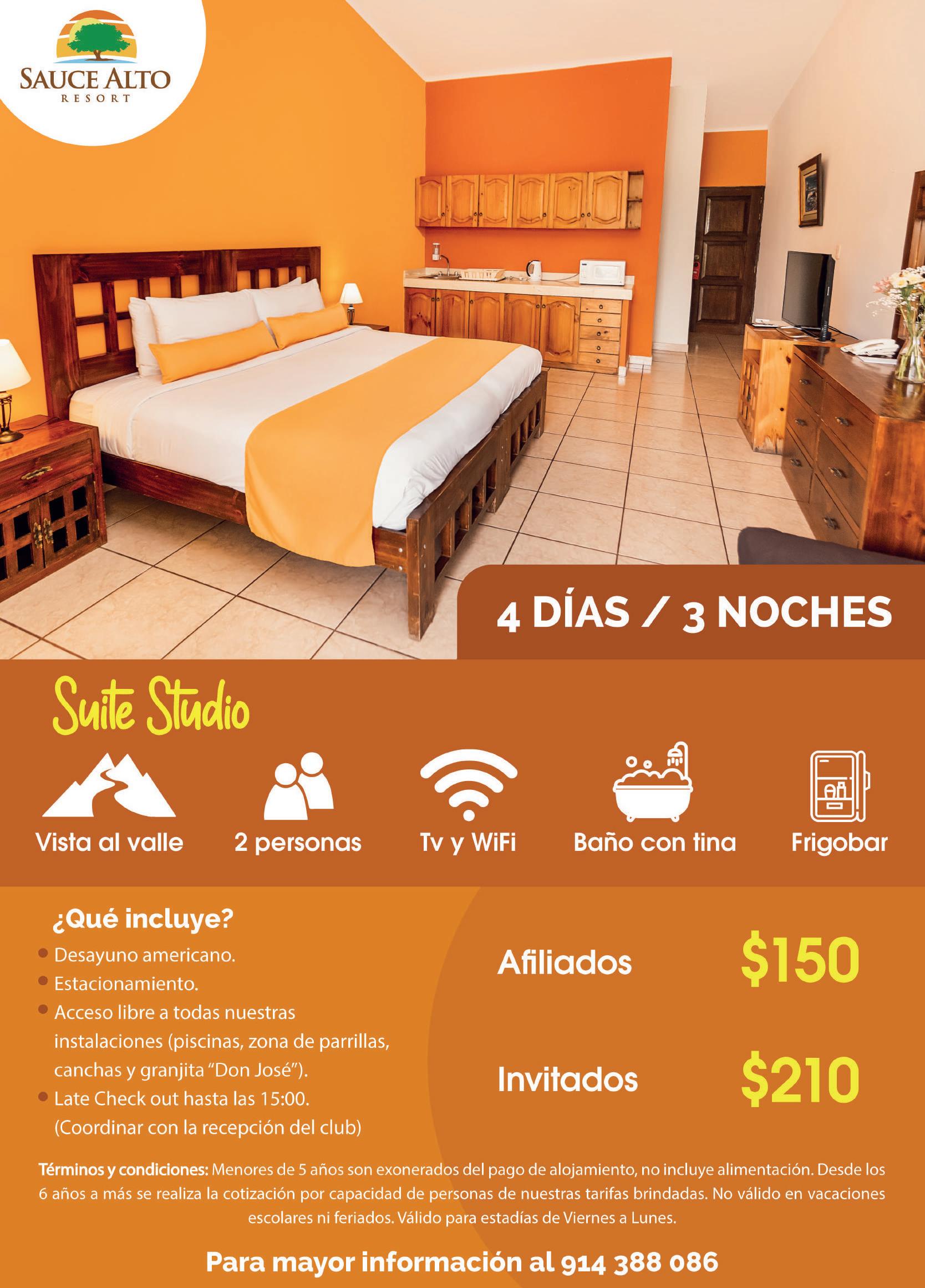¿Qué incluye? *precios por noche Desayunos. Estacionamiento. Acceso libre a todas nuestras instalaciones (piscinas, zona de parrillas y canchas). Acceso a la granjita “Don José”. Contamos con los protocolos de higiene y limpieza para su seguridad en Sauce Alto Resort. Términos y condiciones: Menores de 5 años son exonerados del pago de alojamiento, no incluye alimentación. Desde los 6 años a más se realiza la cotización por capacidad de personas de nuestras tarifas brindadas. No válido en vacaciones escolares ni feriados. Válido para estadías de Domingo a Jueves hasta el 06 de julio de 2023. Para mayor información al 914 388 086 Para 4 personas $57 $90 AFILIADOS INVITADOS 40%