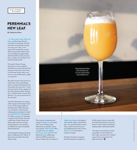 To perfect Perennial’s new recipe, cellar manager Chris Kinast turned to one of the industry leaders in Northeast IPAs, Trillium Brewing Co. near Boston. The breweries collaborated and released a limited run of Q:WWJCD? A:IPA (named for Trillium co-owner JC Tetreault) in August 2018. The beer featured a hefty dose of both Mosaic and Galaxy hops, but the new speltbased malt gave it the signature and difficult-to-achieve mouthfeel Perennial desired.