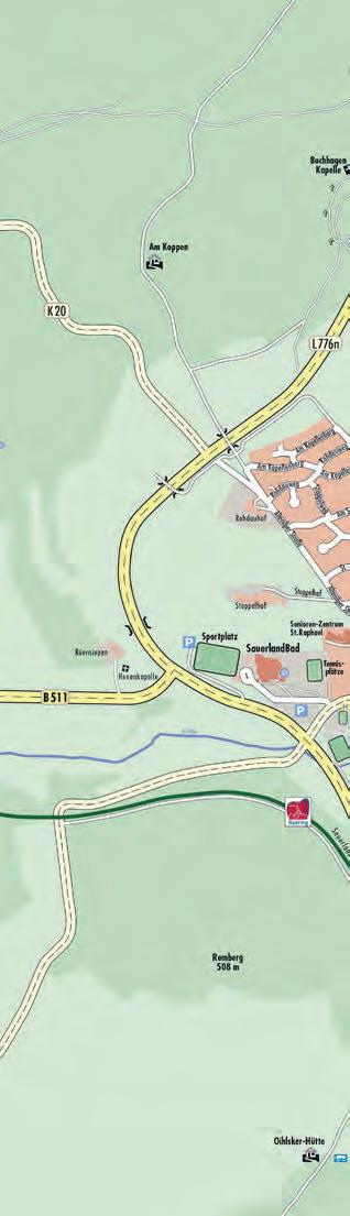 Koppen-Hütte mit Kneippanlage (Armbecken) 23 Oilsker-Hütte mit Kneippanlage 24 Kalte Schlade mit Kneippanlage 25 Schulzentrum 26 Deutsches Rotes Kreuz 27 Feuerwehr 28 Polizei 29 Stadtsparkasse 30 Volksbank Bushaltestellen Parkplätze 7 8 9 18 23 22 WWW.SCHMALLENBERGER-SAUERLAND.DE
