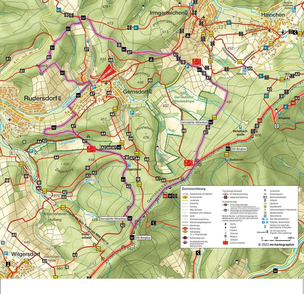 Startpunktadresse für das Navigationsgerät: Gernsdorfer Straße 19, 57234 Wilnsdorf; Koordinaten: 50.845596, 8.169506 Vor und nach Ihrer Wanderung bieten sich Einkehrmöglichkeiten: n Landgasthof Drei Eichen, Wilnsdorf-Gernsdorf Tel. 02737 9576 n Hotel Restaurant Gästehaus Wilgersdorf, Wilnsdorf-Wilgersdorf, Tel 02739 89690