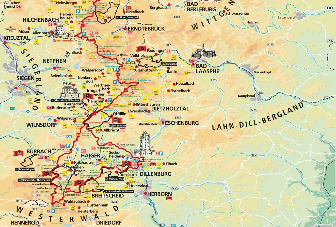 Rothaarsteig-Spuren von Norden nach Süden: