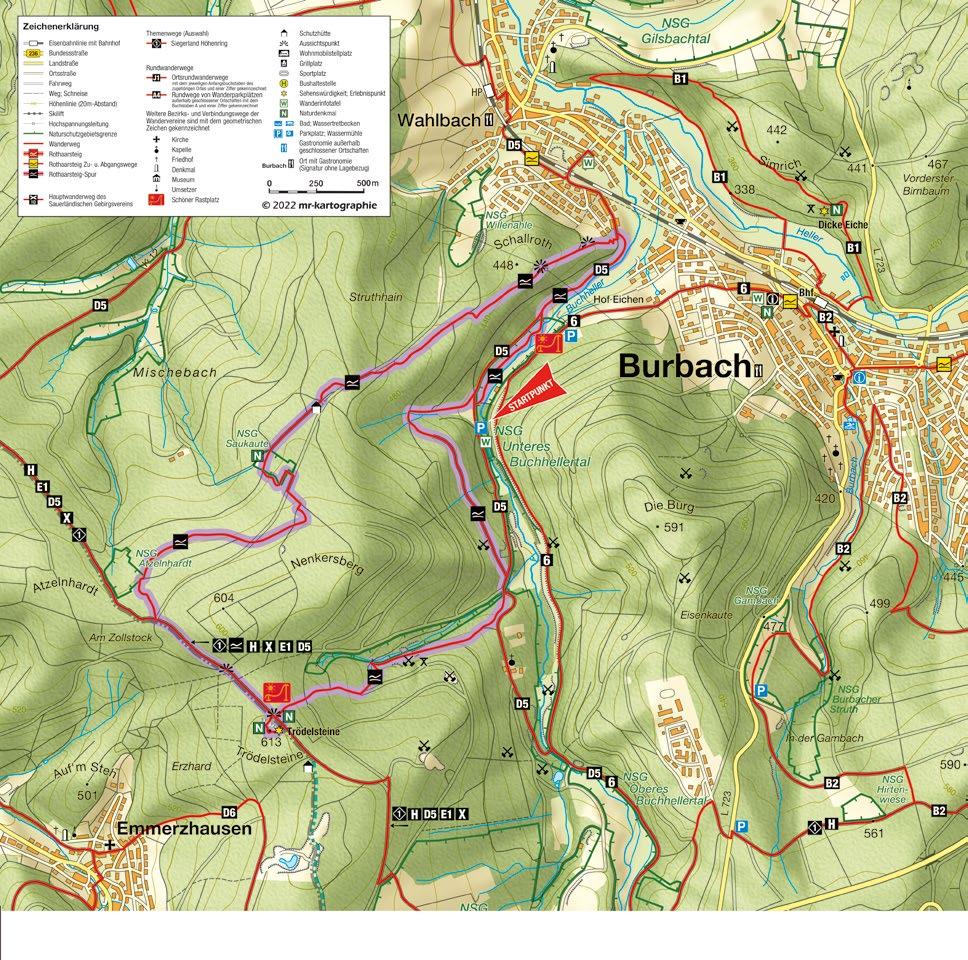 Die Rothaarsteig-Spur „Trödelsteinpfad” führt vom tiefsten Punkt im „Buchheller-Tal” zum höchsten Punkt am Naturdenkmal „Trödelsteine“. Unterwegs erwartet Sie landschaftliche Vielfalt und Siegerländer Bergbautradition, d. h. die besondere Burbacher Naturlandschaft im Übergang vom Rheinischen Schiefergebirge zum Westerwald, ihre basaltartige Landschaft und zahlreiche Beispiele aus dem historischen Eisenerzabbau. Besonders schön: die Kombination aus abenteuerlichen Pfaden, mystischen Waldpassagen, idyllischen Wiesenlandschaften, tollen Aussichten und dem plätschernden Wasser. Tipp: Am Ufer der „Buchheller” laden viele romantische Abschnitte zu einer Rast ein. Alternativ empfiehlt sich eine Einkehr bei Gastronomiebetrieben in Burbach.