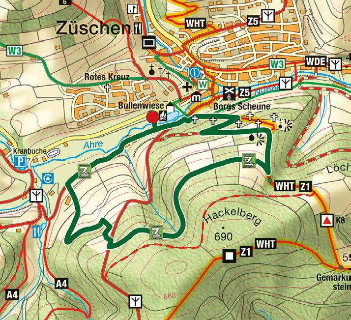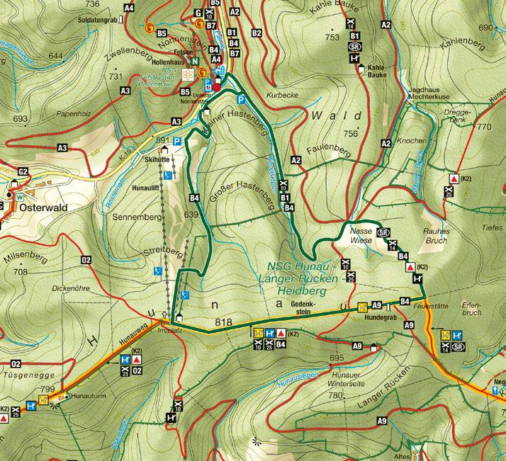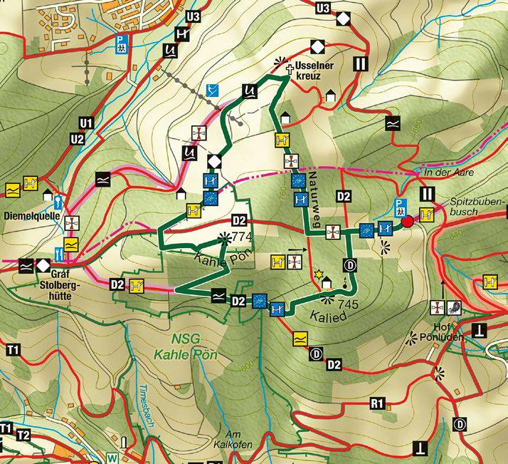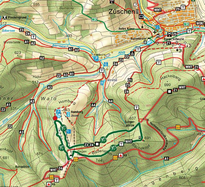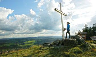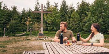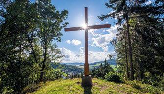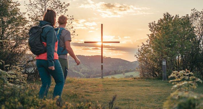 Unterwegs lädt die munter sprudelnde Luisenquelle zu einem erfrischendenFußbadein.ÜberdenKlippenpfad, zwischen Felsen und Wurzeln am Hang entlang, gelangen Wandernde zum Gipfelkreuz und lassen sich in 703 Meter Höhe den Wind um die Nase wehen. Über die andere Bergseite führt die Tour zurück nach Olsberg. n