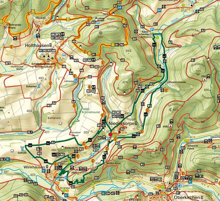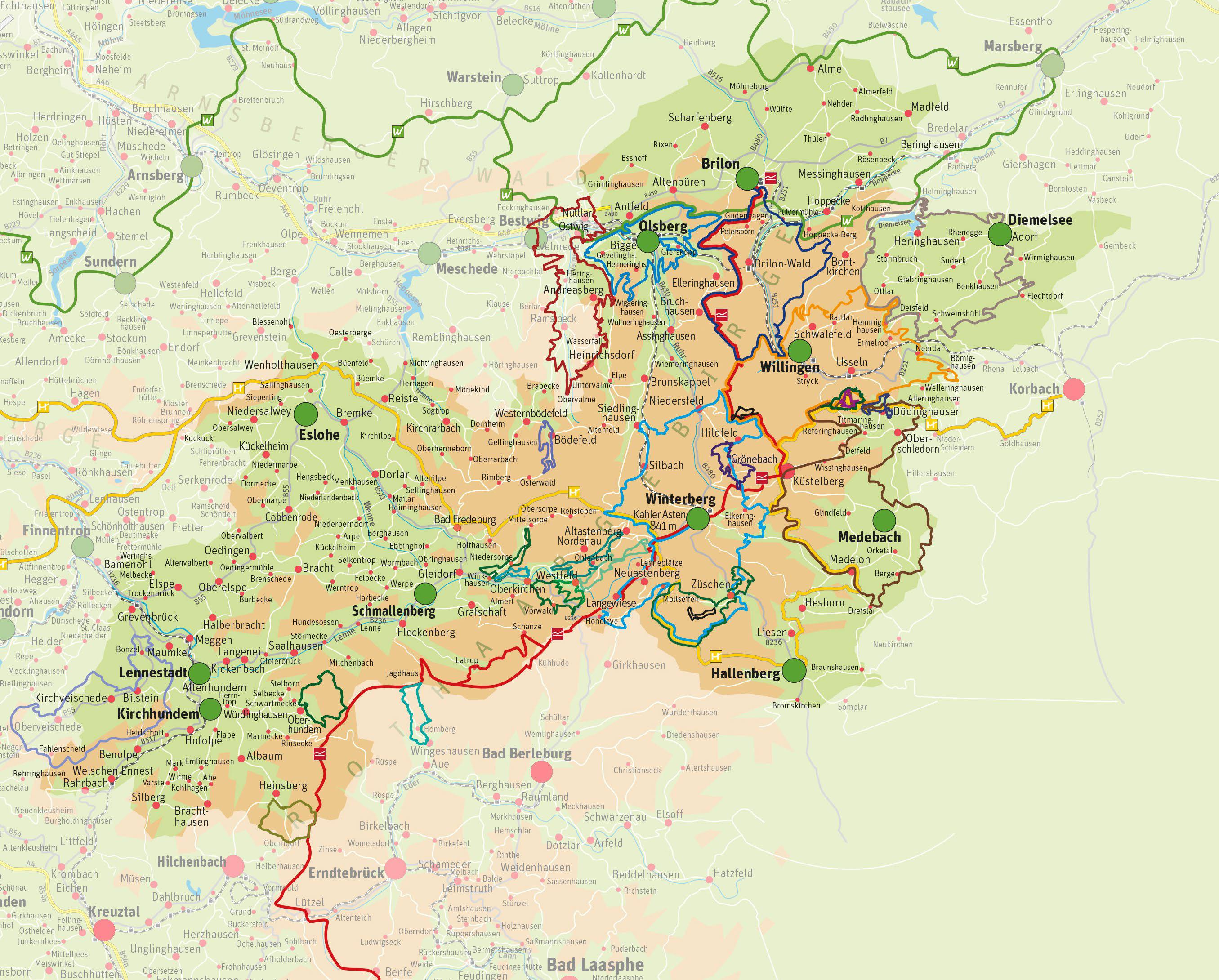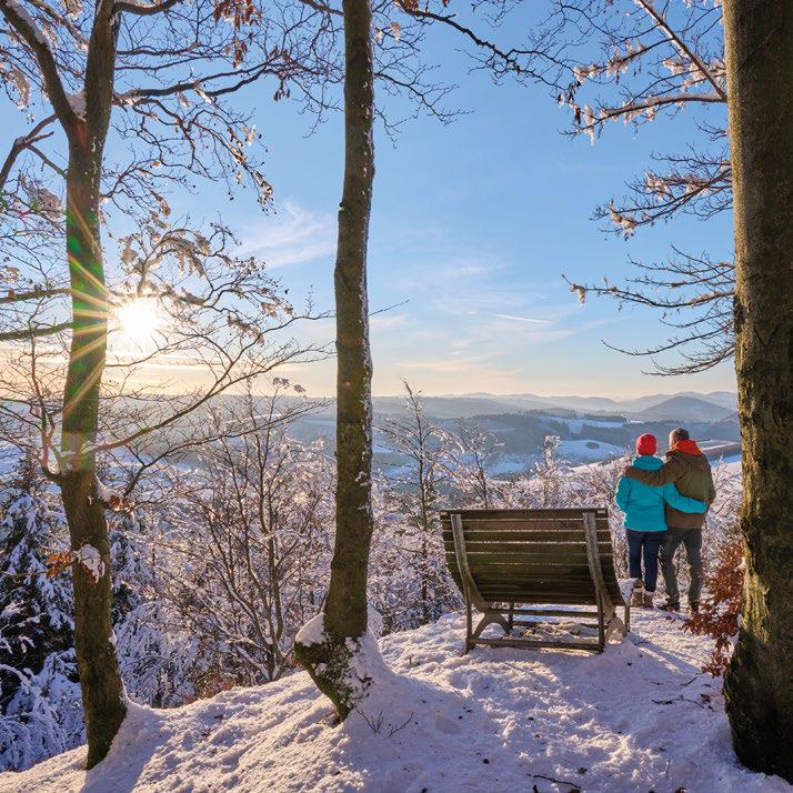Die Sauerland-Wanderdörfer, das sind Brilon, Diemelsee, Eslohe, Hallenberg, Kirchhundem, Lennestadt, Medebach, Olsberg, Schmallenberg, Willingen und Winterberg. Prämierte Fernwanderwege wie der Rothaarsteig, die Sauerland-Waldroute und der Sauerland-Höhenflug, aber auch preisgekrönte Mehrtagesrouten voller Naturerlebnis überspannen die Region. Auch für Tages- oder Halbtagestouren haben die SauerlandWanderdörfer etwas zu bieten, die Sauerland-Spuren. Dies sind kürzere Rundwege, die über verträumte Pfade und auf naturnahem Untergrund zu reizvollen Erlebnisorten führen.
