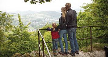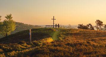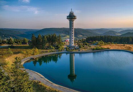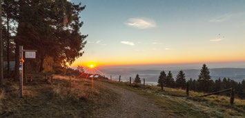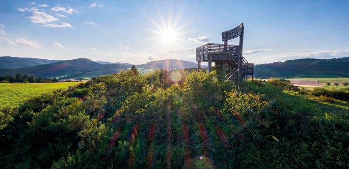 scheide. Oben auf den Gipfeln erwartet die Wandernden ein überwältigender Panoramarundblick: In einer 360-Grad-Aussicht schaut man weit über die Mittelgebirgslandschaft. Ein kurzer Abstecher führt zur Feuereiche mit ihrem bronzenen Feuerband. Sie stellt die Entwicklungsgeschichte der Menschen im Zusammenspiel mit Holz und Feuer dar. n