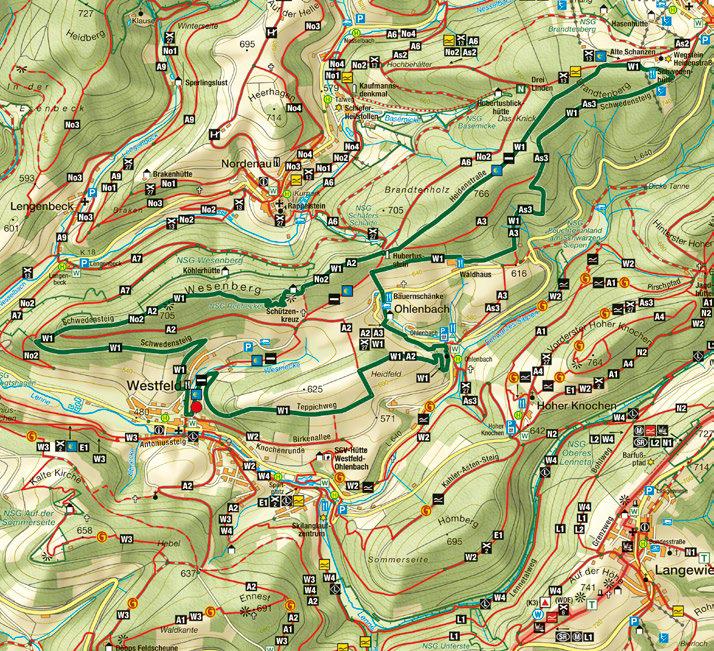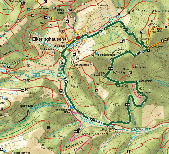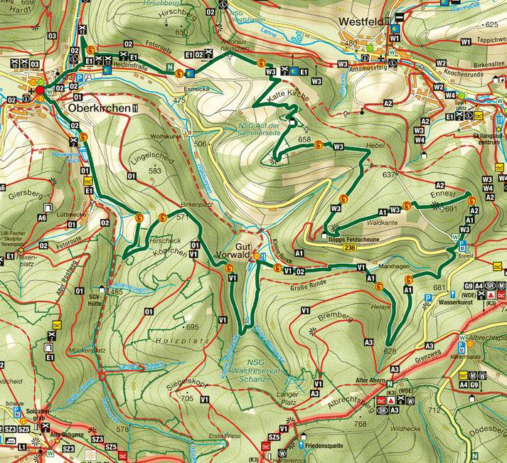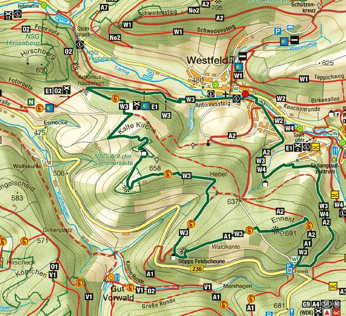 Als Rundwanderweg (67Kilometer) berührt er alle Dörfer der Stadt, führt über die höchsten Berge, erschließt die alten, historischen Spuren des ehemaligen Klosters Gindfeld und windet sich durch unberührte Täler des Sauerlandes.