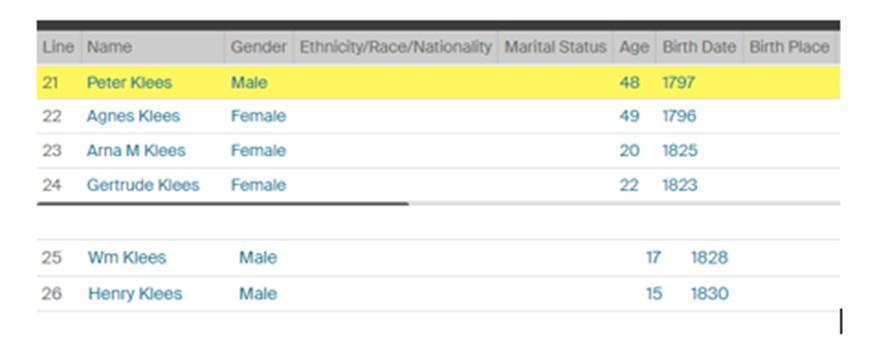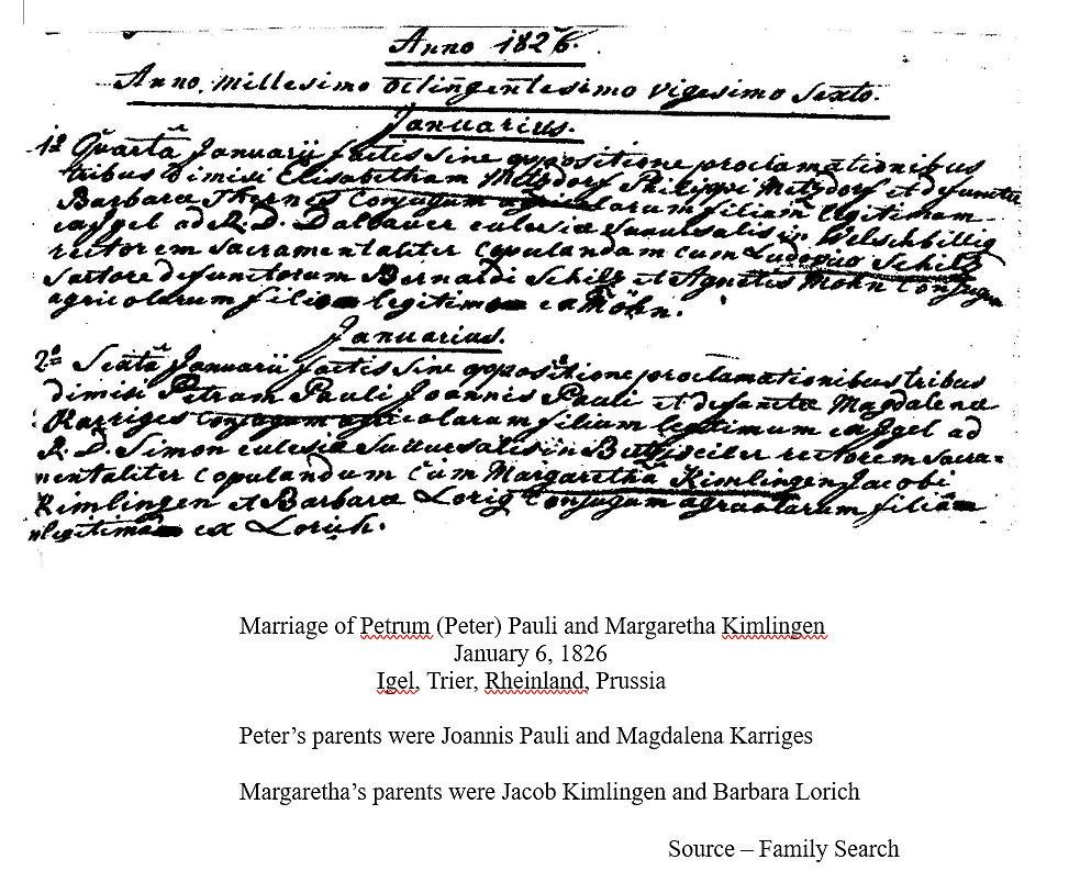 Peter and Agnes’ first child Jodocus Klaes did not immigrate. Their second child was an unknown Klaes, born in 1822. We do not know the fate of this child. Gertrude, Anna, Wilhelm, and Heinrich all immigrated with Peter and Agnes in 1845.