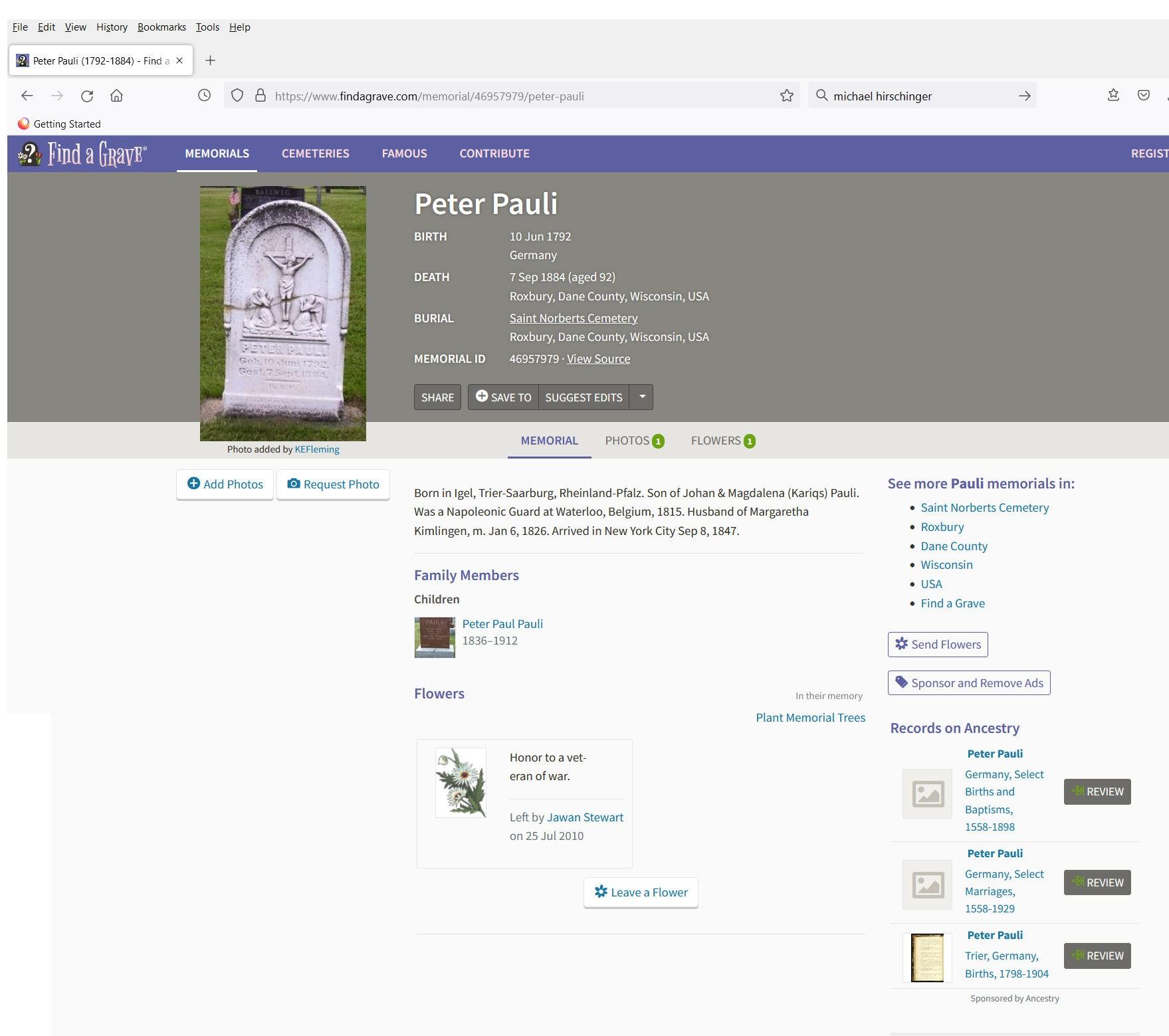 Lori Ploetz, has speculated that, “…the first-hand account of his service was supposedly made by his daughter Anna Maria Staeler/Stehler with whom he lived, pretty much full time, after the arrival in America. I believe he was living with the Staelers in Roxbury when he died, and he was buried in the old St. Norbert's cemetery. That's my guess.