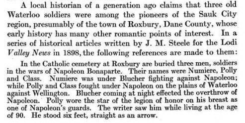 In the Catholic cemetery at Roxbury are buried three men, soldiers in the wars of Napoleon Bonaparte. Their names were Numiere [this is the son of Joseph Neumaier Sr. who was a Napoleonic soldier, and never came to America. This son did not fight in the war], Polly [Pauli] and Class [Klaes]. Numiere was under Blucher fighting against Napoleon, while Polly and Class fought under Napoleon on the plains of Waterloo against Wellington. Blucher coming up at night effected the overthrow of Napoleon. Polly wore the star of the Legion of Honor on his breast as one of Napoleon’s guards. The writer saw him while living at the age of ninety. He stood six feet, straight as an arrow. Mr. Class went at the age of fifteen as a substitute for his brother, who had a family, and served until the down fall of Napoleon. Being at the home of his daughter, I went out to where her father was dressing the grape vines. There stood the man who had shouted ‘Victory’ and suffered defeat on the blood-red fields of Spain, one of the army that crossed the Niemen 500,000 strong to invade Russia, one of the number who stormed the Russian entrenchments at Borodine, fighting uncovered in the open plain, causing Napoleon to exclaim at St. Helena, ‘You immortal heroes.’ He saw the burning of Moscow, the greatest conflagration of modern times lived and fought through that fearful retreat.”
