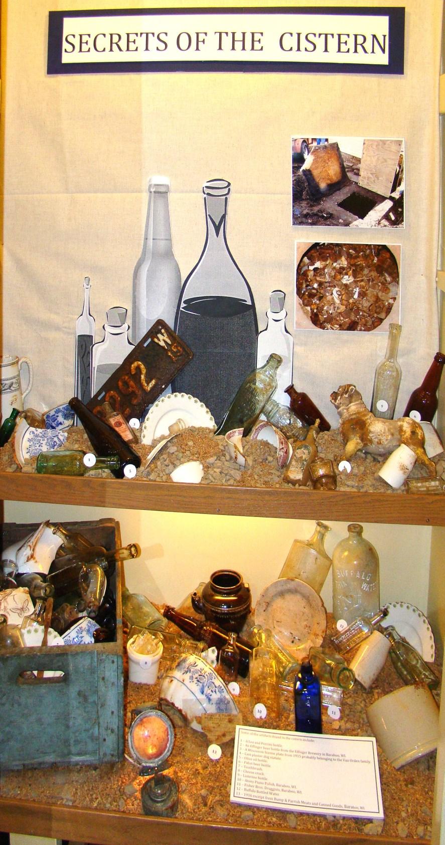 Peering inside the cistern, the worker discovered a large pile of debris. Paul Wolter, a board member of the historical society at the time, entered the cistern later that day; and quite a collection of artifacts was removed consisting mostly of rusted metal cans, glass jars, old light bulbs and large quantities of antique bottles some imprinted with Baraboo business names.