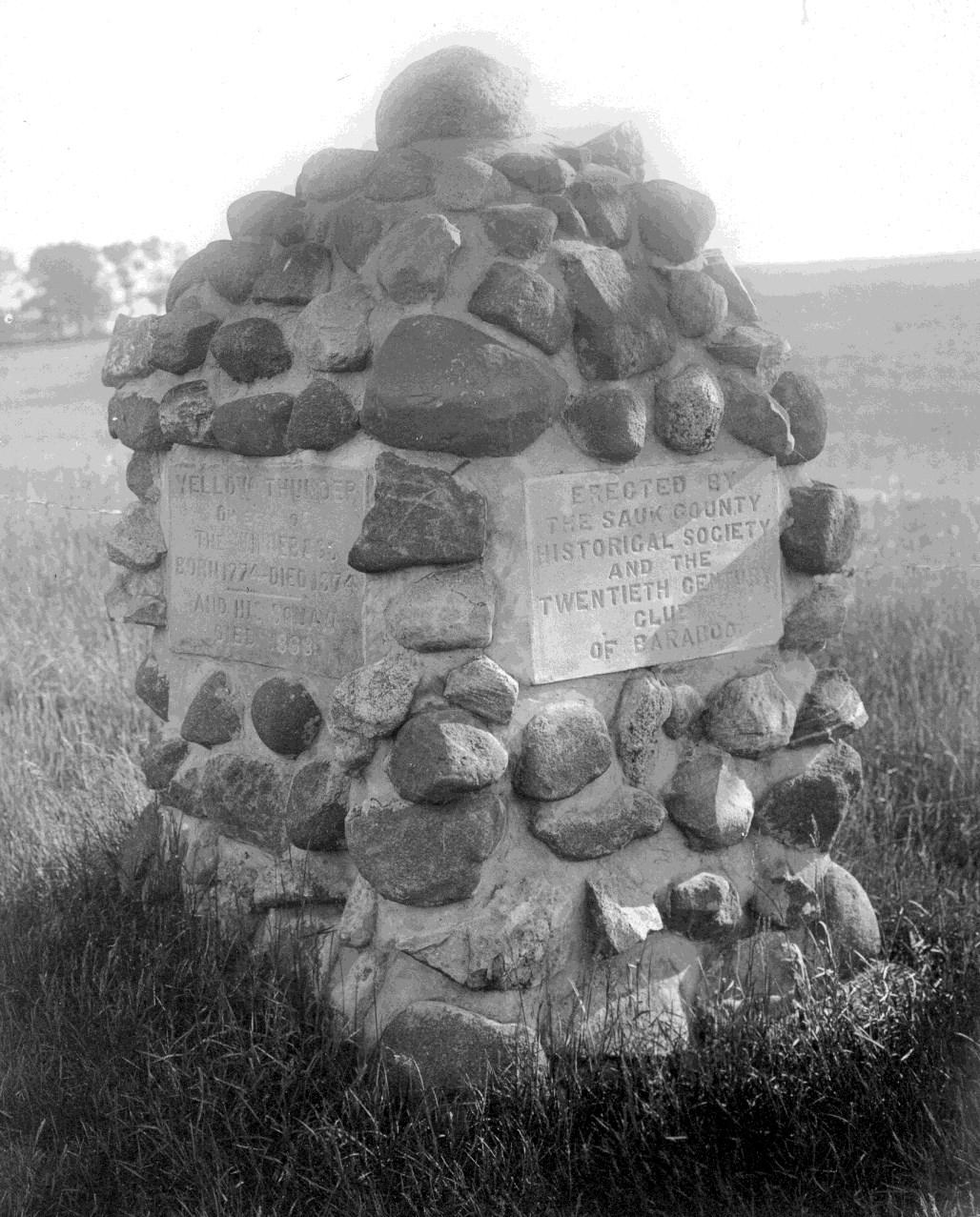 The memory of Ho-Chunk Chief Yellow Thunder and his wife and the security of their remains was the focus of attention in 1909. With the help of the Twentieth Century Club of Baraboo, a marker containing the remains was erected on what is now County A north of Baraboo.