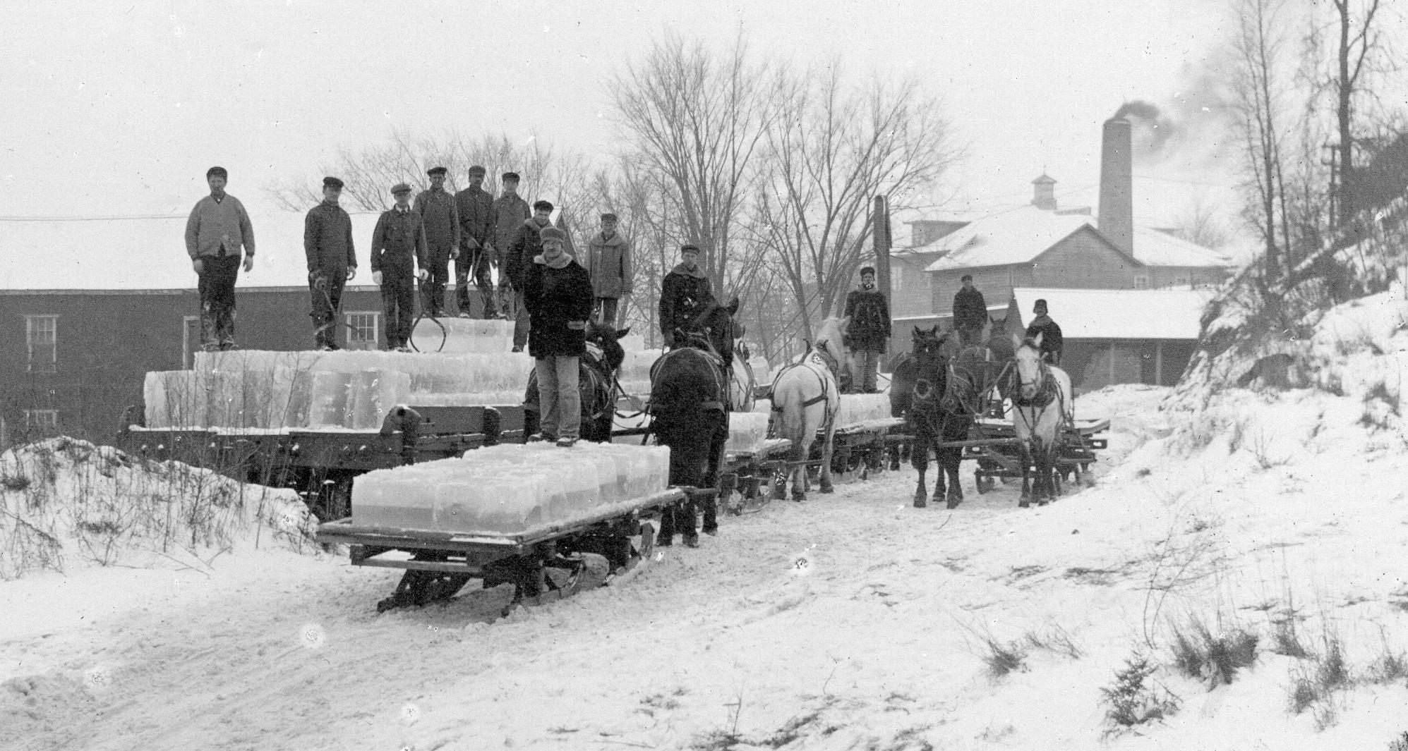 Large blocks of ice were harvested from lakes and rivers, stored in ice houses and covered with sawdust or straw, which extended its life well into the following fall.