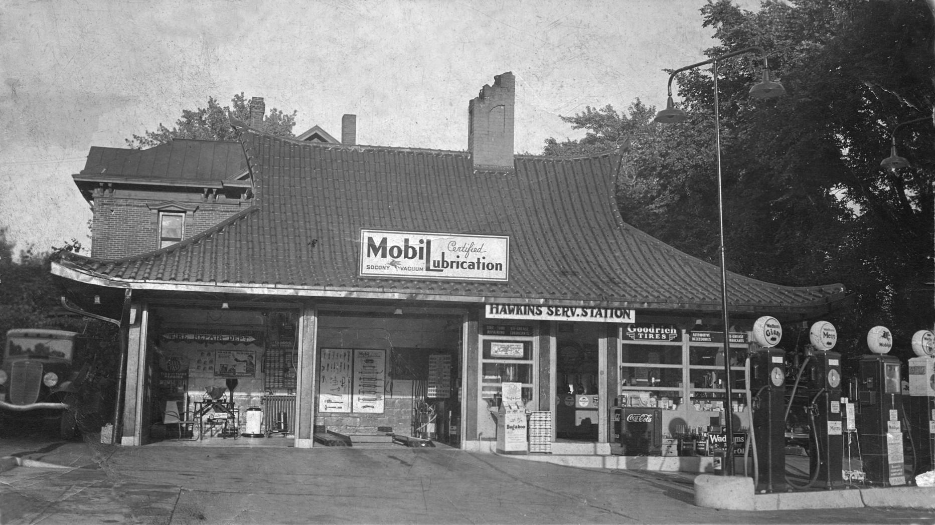 The pagoda-style gas station depicted here, was located at the corner of 2nd & Broadway in Baraboo in 1930. It was built in 1928, and was operated by C. Hawkins.