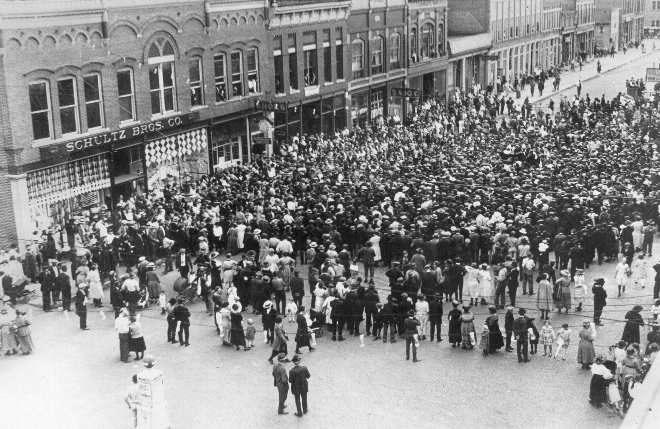 Wilkinson, several factory representatives, and additional local dignitaries seated in a double carriage, led the parade, followed by the Badger State Band all decked out in their colorful uniforms. Following them was a long line of lumber wagons loaded with a dozen reapers and four mowers. The parade wound its way through town from the depot and ended up on the Oak Street square in front of the Warren Hotel where “a large portion of the city population was photographed by Sim Mould.” See photo.
