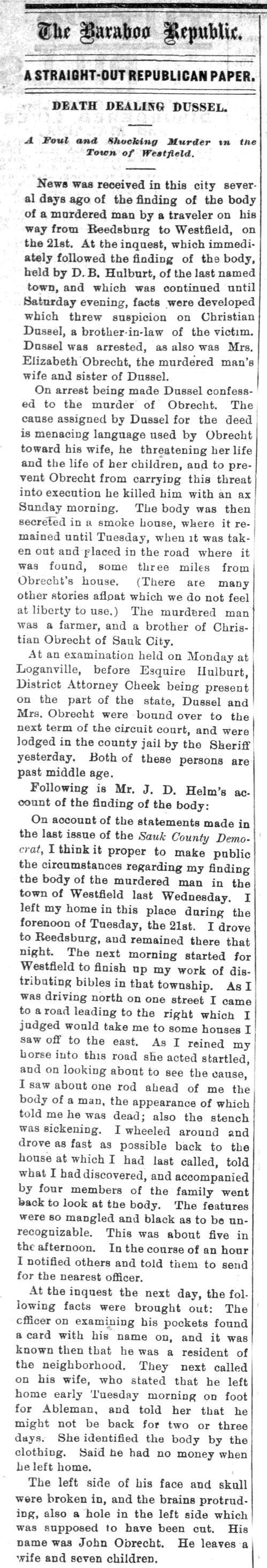 News was received in this city several days ago of finding of the body of a murdered man by a traveler on his way from Reedsburg to Westfield, on the 21st. At the inquest, which immediately followed the finding of the body, held by D.B. Hulburt, of the last named town, and which was contained until Saturday evening, facts were developed which threw suspicion on Christian Dussel, a brother-in-law of the victim. Dussel was arrested, as also was Mrs. Elizabeth Obrecht, the murdered man’s wife and sister of Dussel.