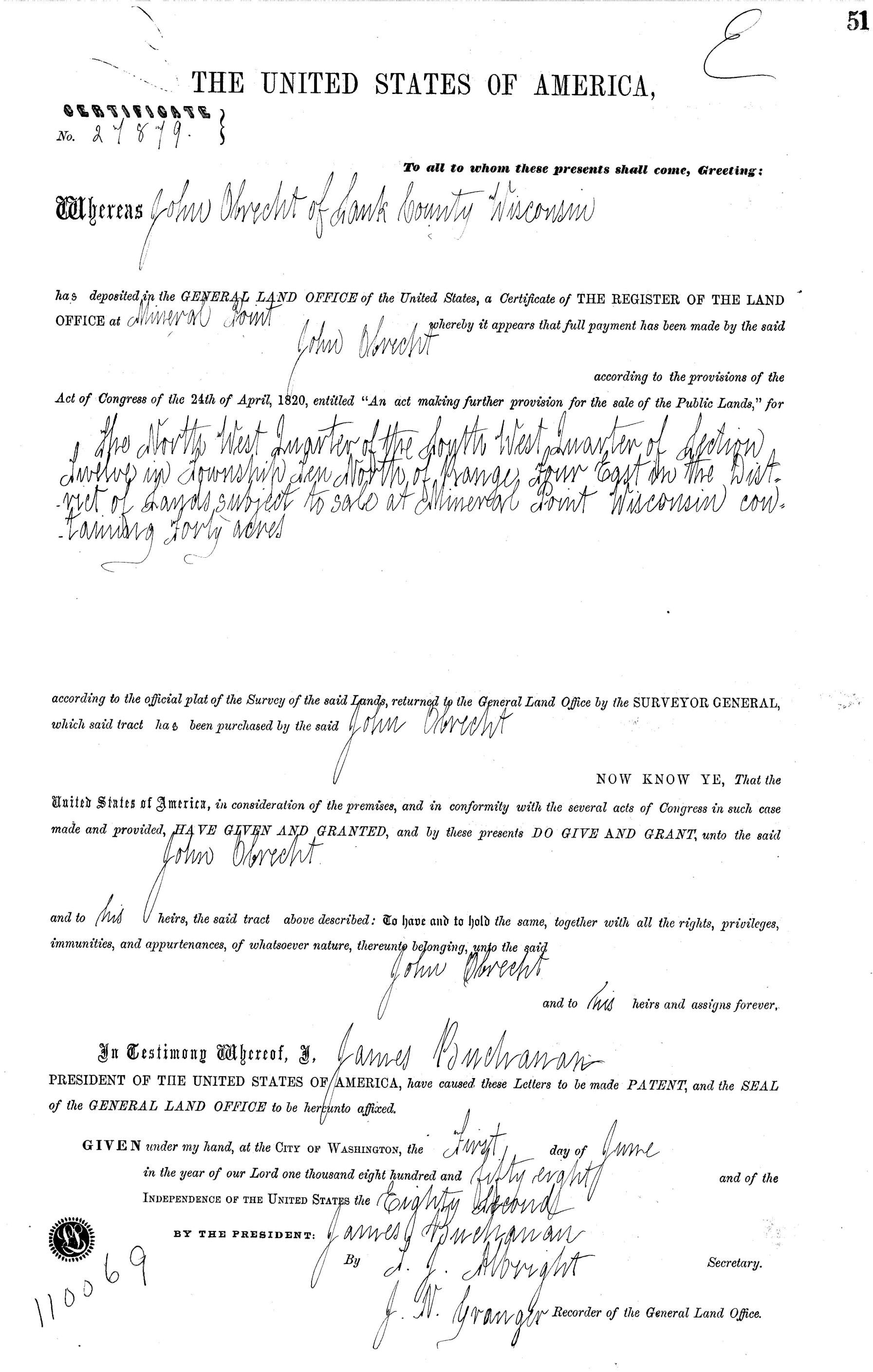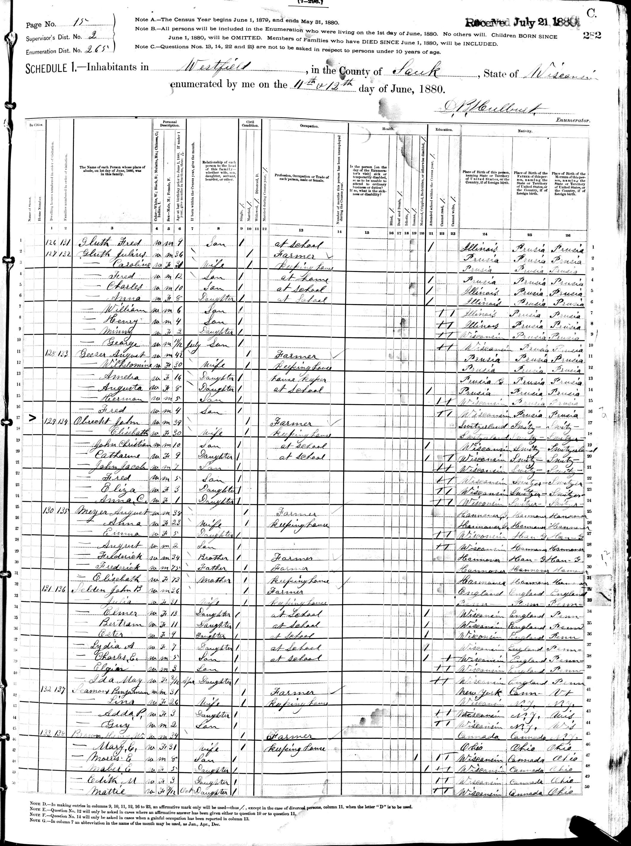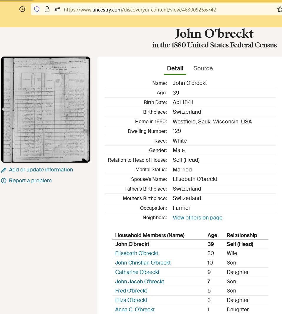 John Obricht was born in Switzerland in 1841, and in 1858 he purchased a tract of land in Sauk Country. At the age of 23, he heeded the call when his country called in July of 1863, and served as a corporal during the Civil War. He was discharged in January of 1866, and went to live in Prairie du Sac, WI. In 1880 he was farming in Westfield, Sauk County, Wisconsin. By 1883, he had been married to Elizabeth Dussel and they were the parents of 7 children, aged 1 to 13.